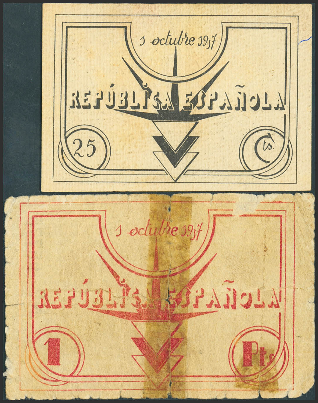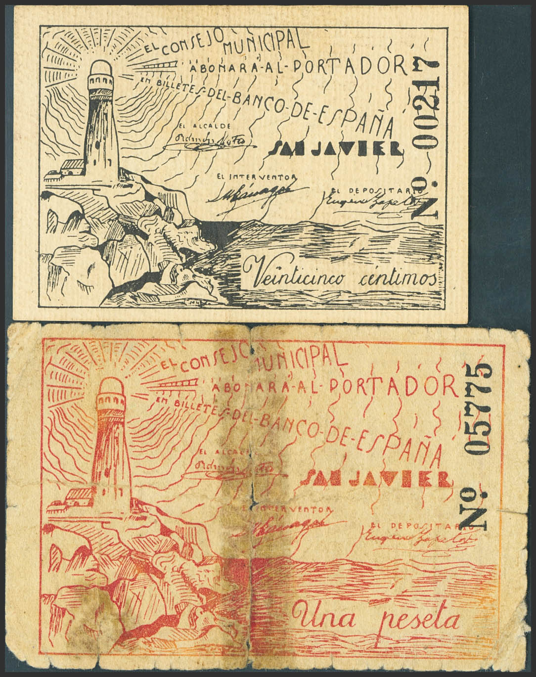 SAN JAVIER (MUGoodIA). 25 Centimos and 1 Peseta. October 1, 1937. (González: 4682/83). Unusual complete series. Good-/Extremely Fine.