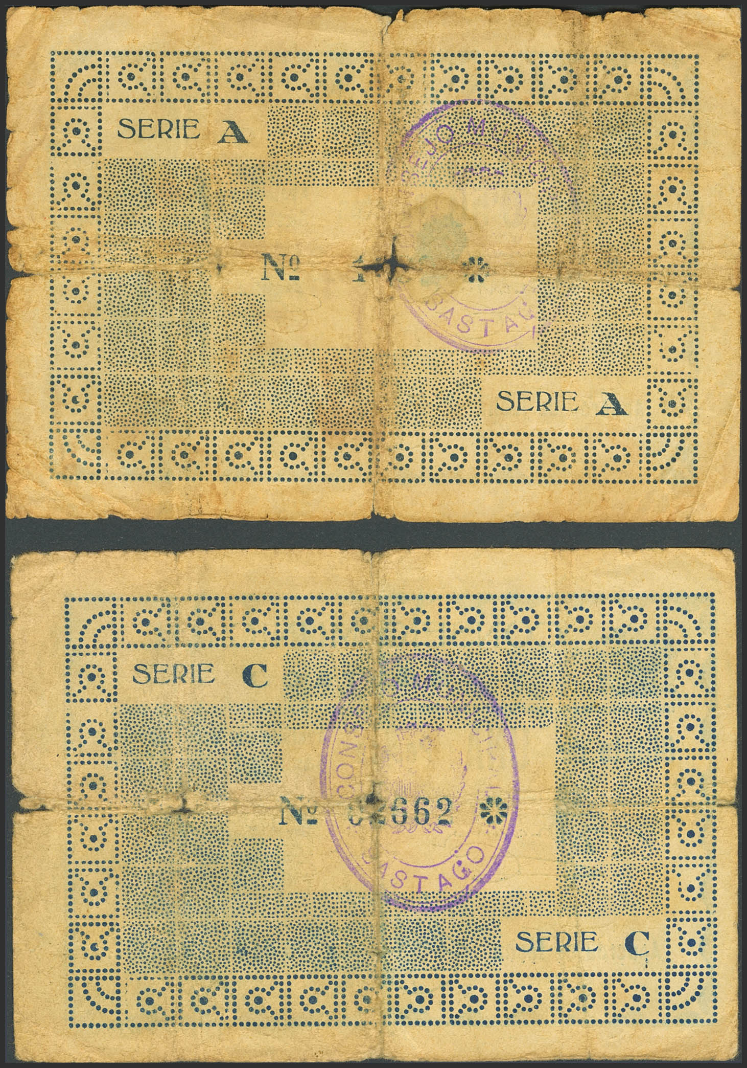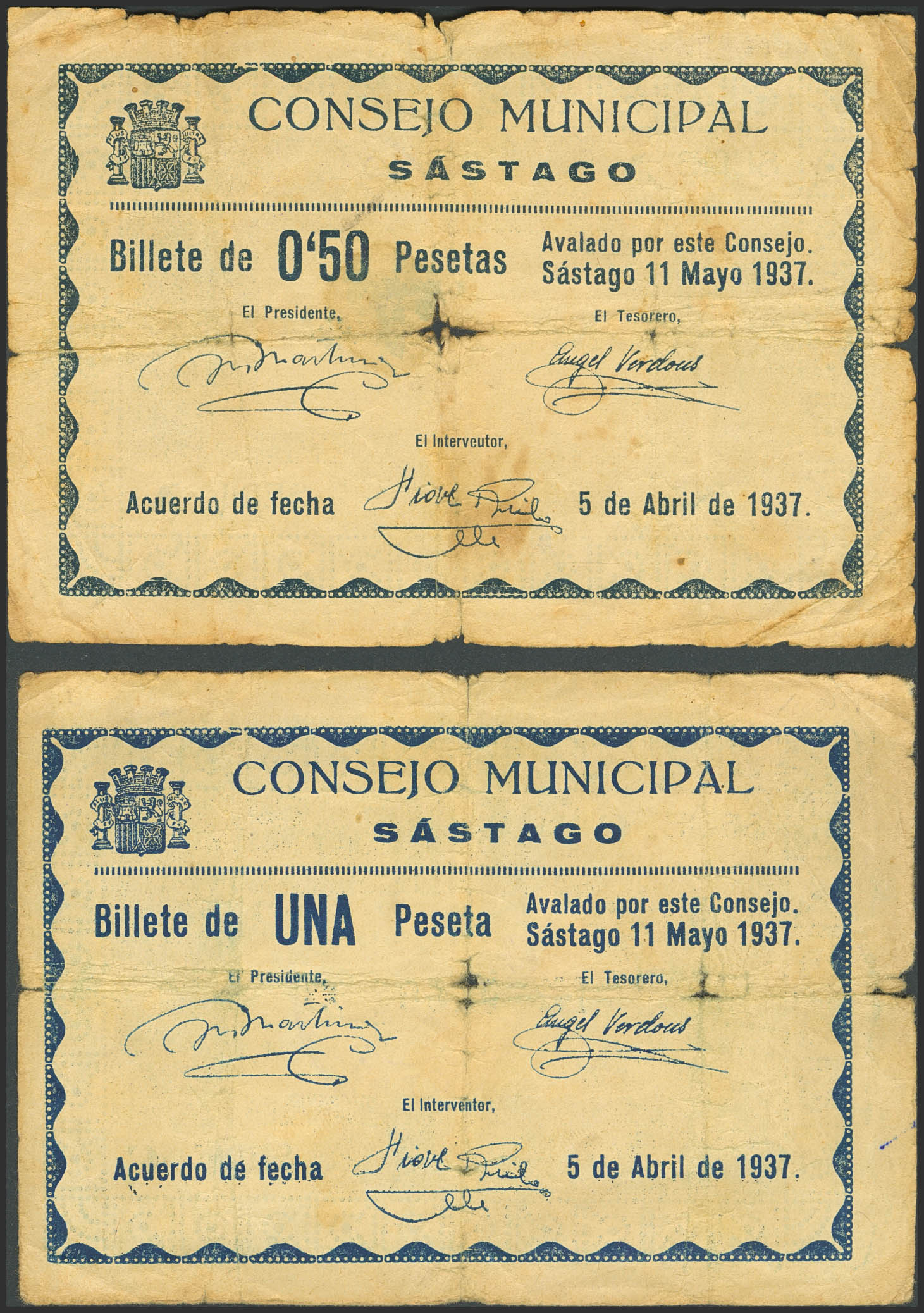 SASTAGO (ZARAGOZA). 50 Centimos and 1 Peseta. April 5, 1937. Series A and C, respectively. (González: 4796, 4797). Unusual. Fine-.