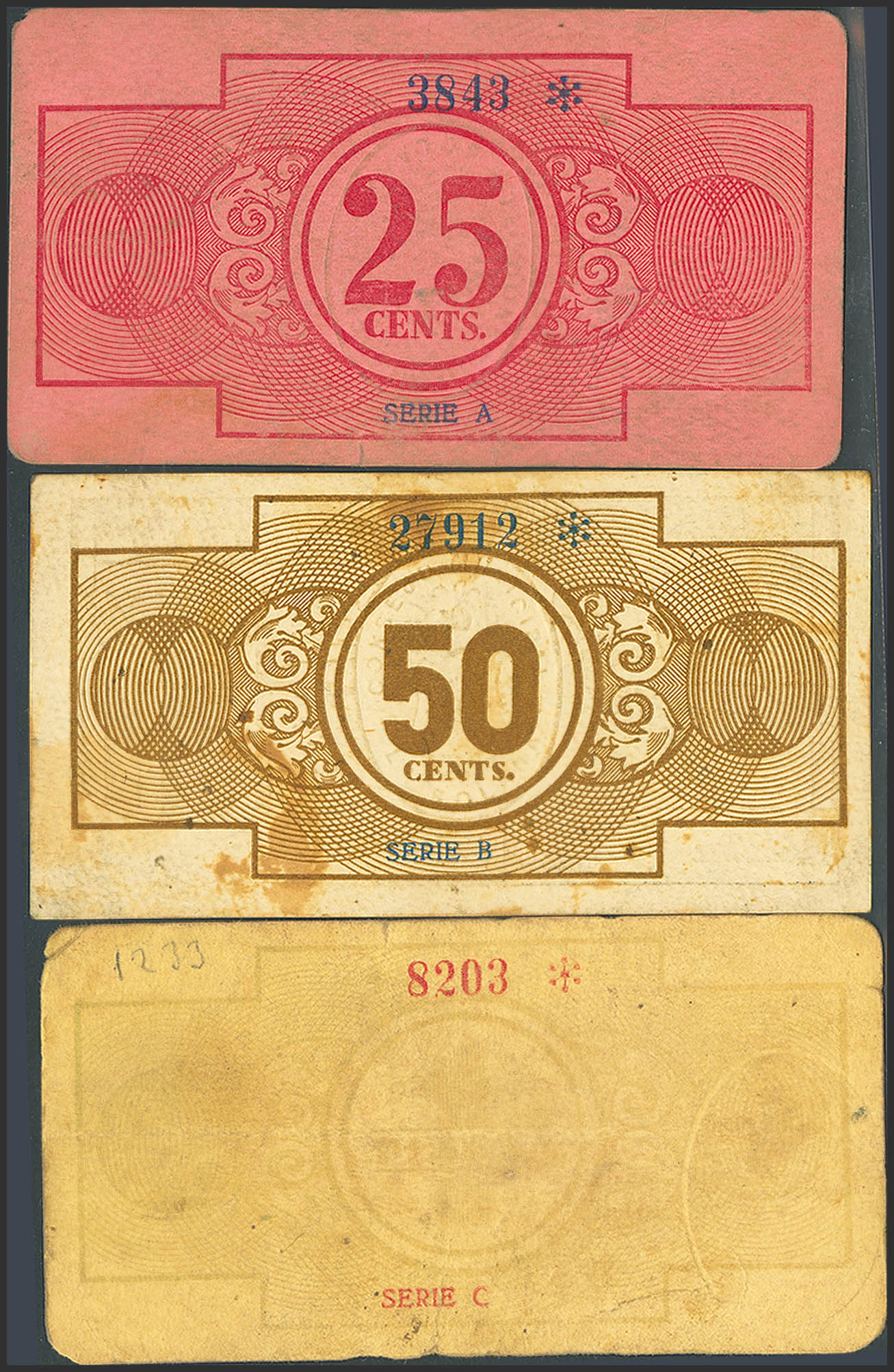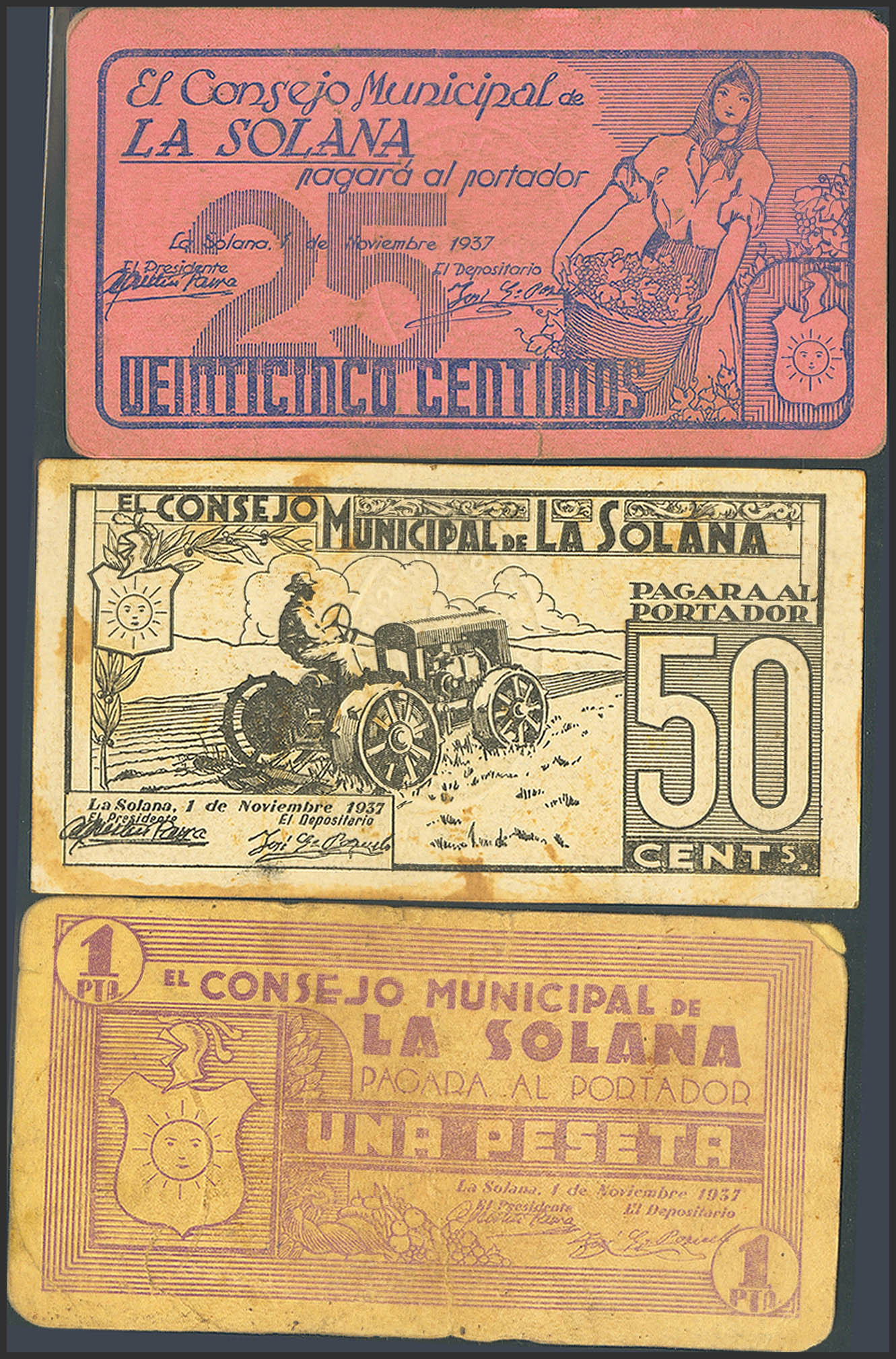 SOLANA (CIUDAD REAL). 25 Centimos, 50 Centimos and 1 Peseta. November 1, 1937. Series A, B and C, respectively. (González: 4888/90). Unusual complete series. EF+++/VF+.
