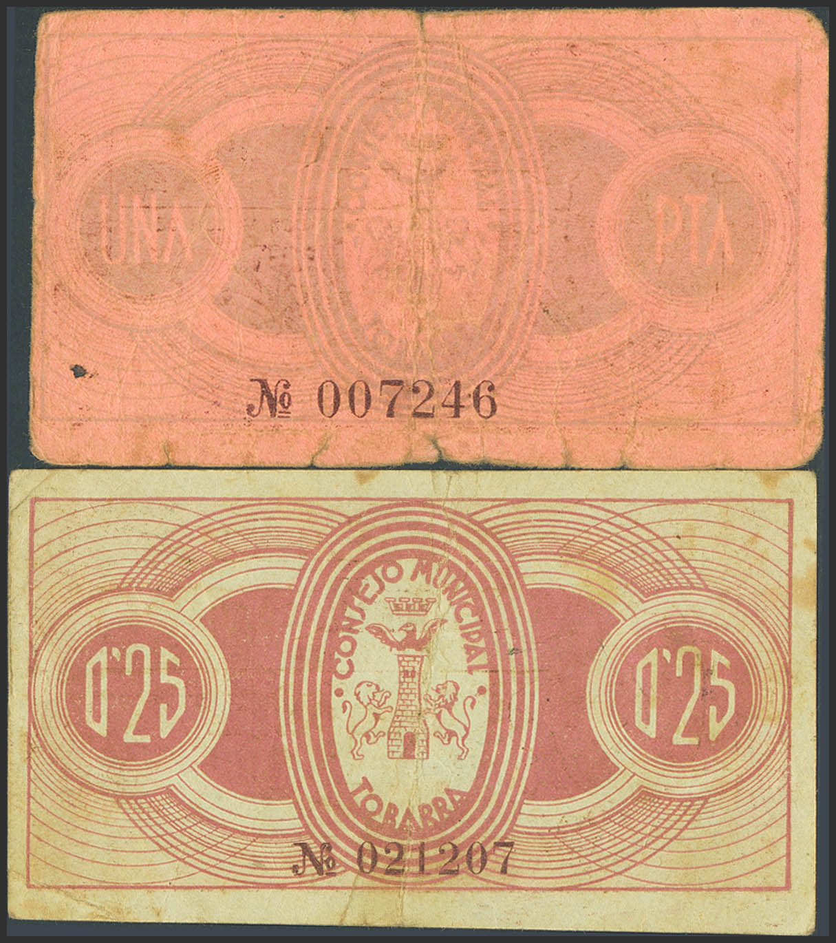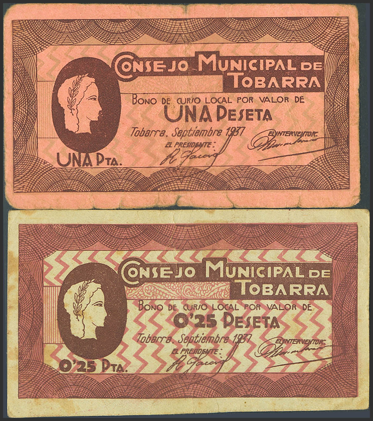 English TOBARRA (ALBACETE). 25 Centimos and 1 Peseta. September 1937. (González: 5018/19). Complete series. VF-.