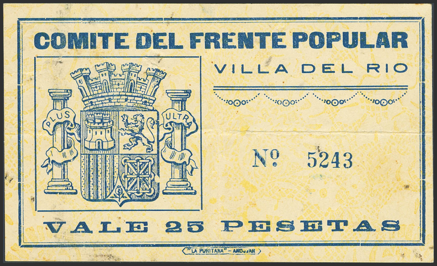 English VILLA DEL RIO (CORDOBA). 25 Pesetas. (circa 1937). (González: 5493). Very rare. VF+.