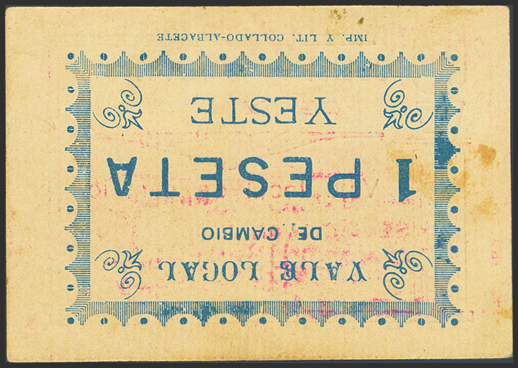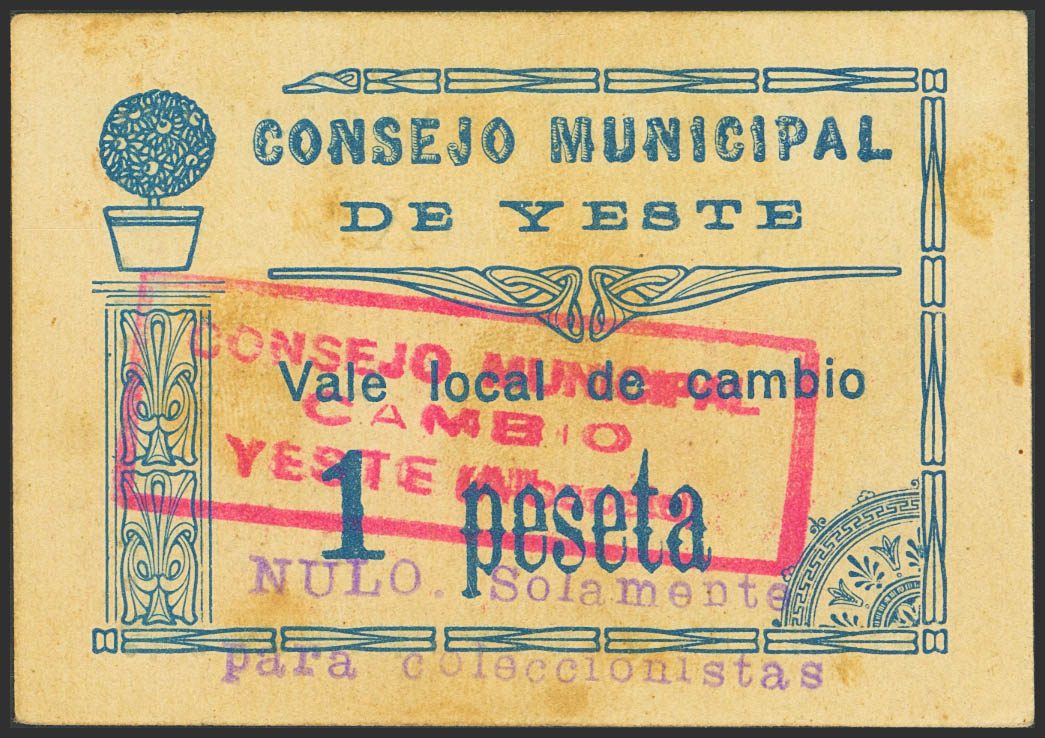English YESTE (ALBACETE). 1 Peseta. (circa 1937). (González: 5837). Very rare. VF+.
