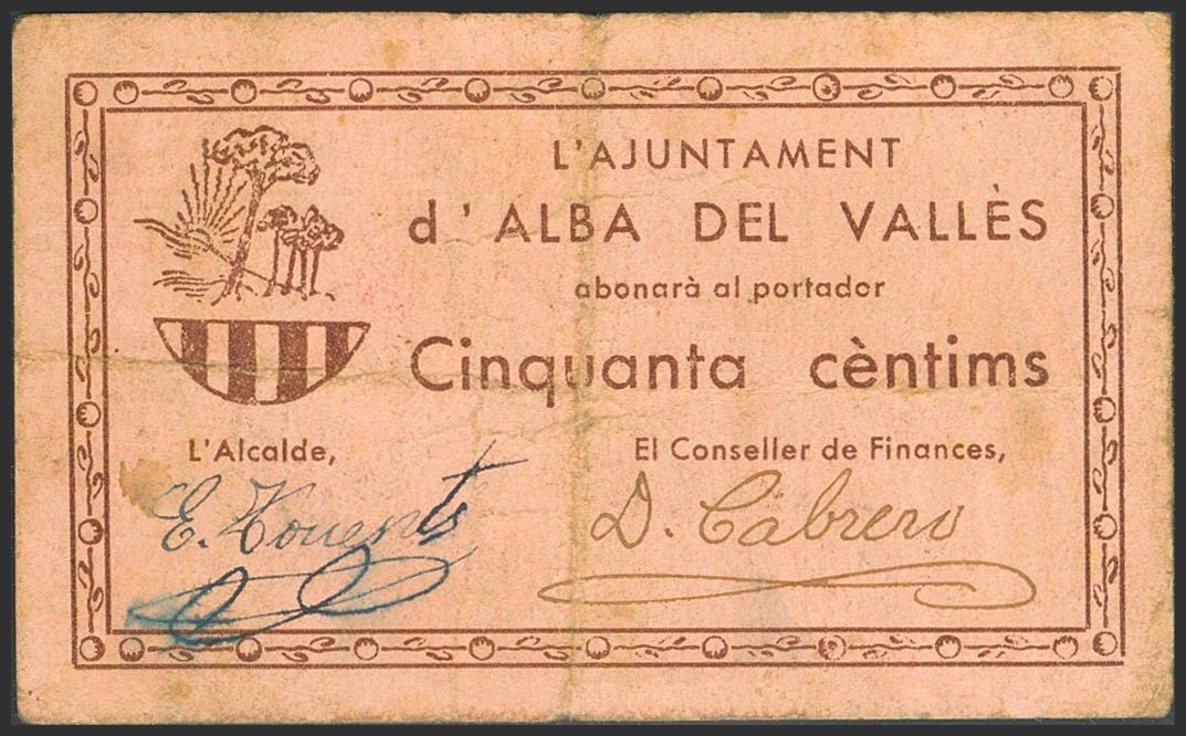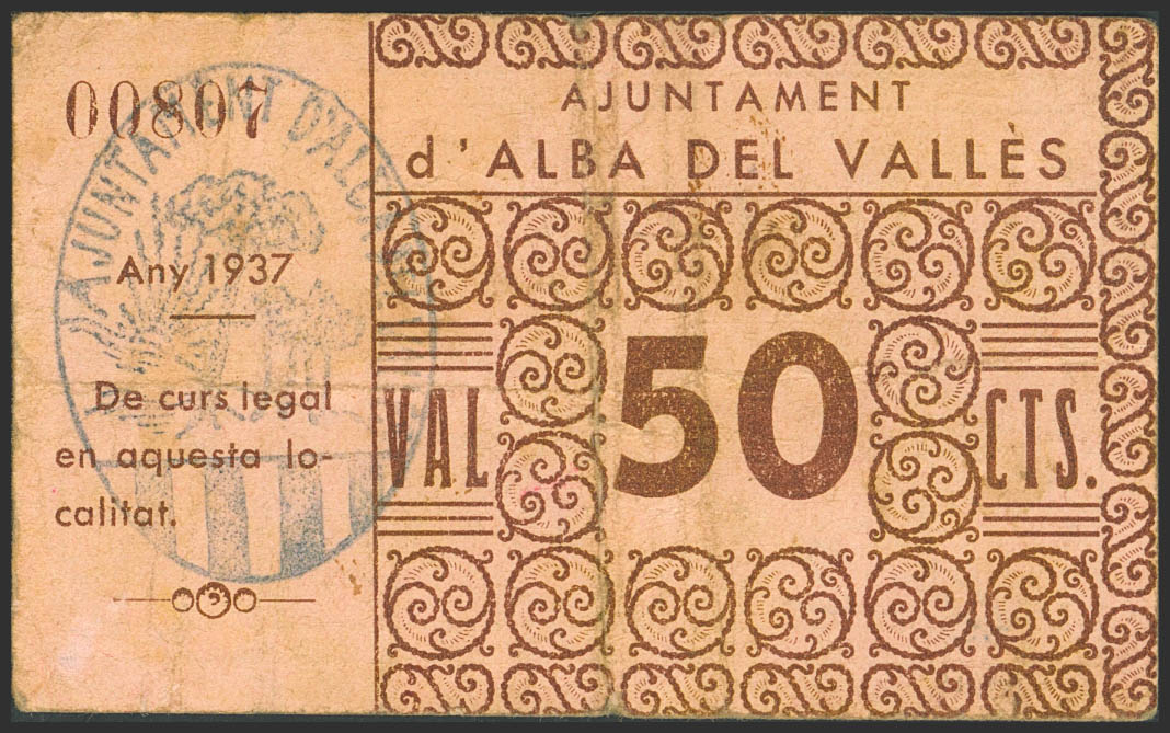 ALBA DEL VALLES (BAGoodELONA). 50 Centimos. 1937. (González: 6087). Rare. VF-.