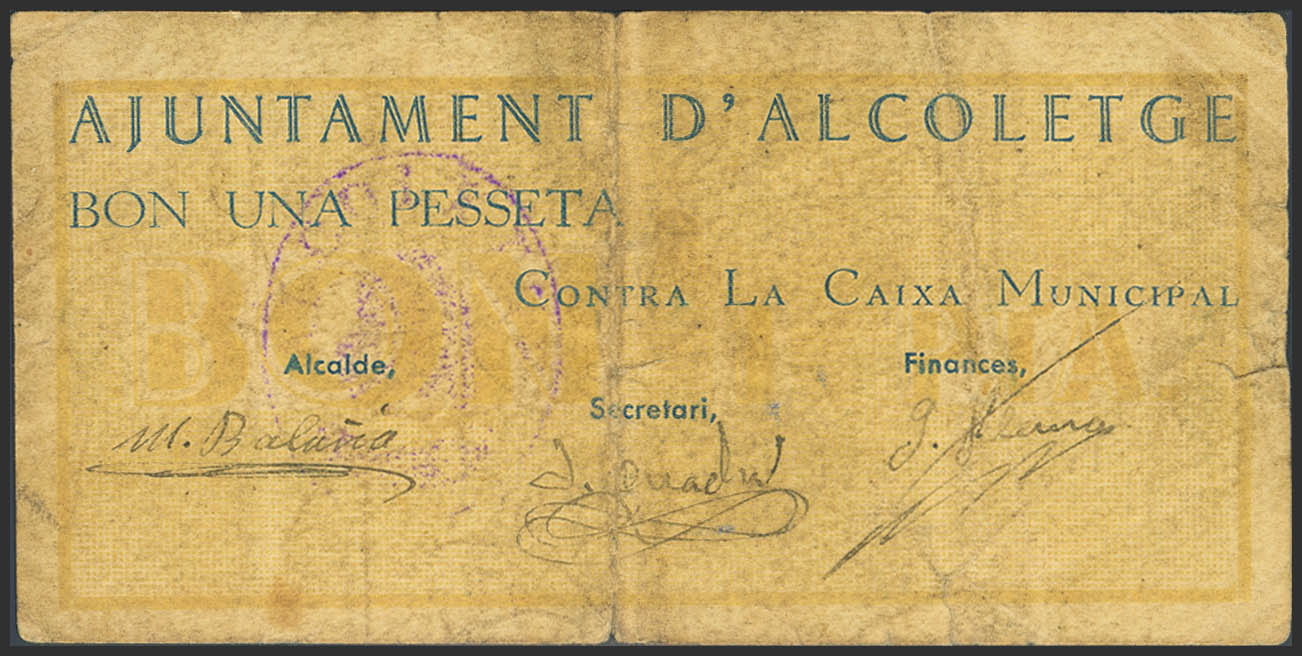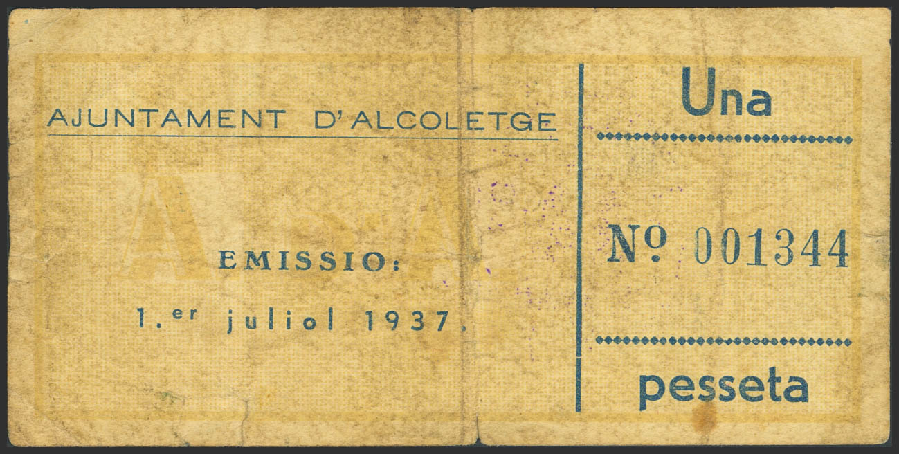 ALCOLETGE (LERIDA). 1 Peseta. July 1, 1937. (González: 6142). Very rare. Good Fine.