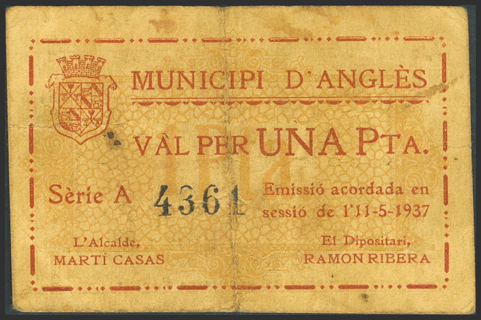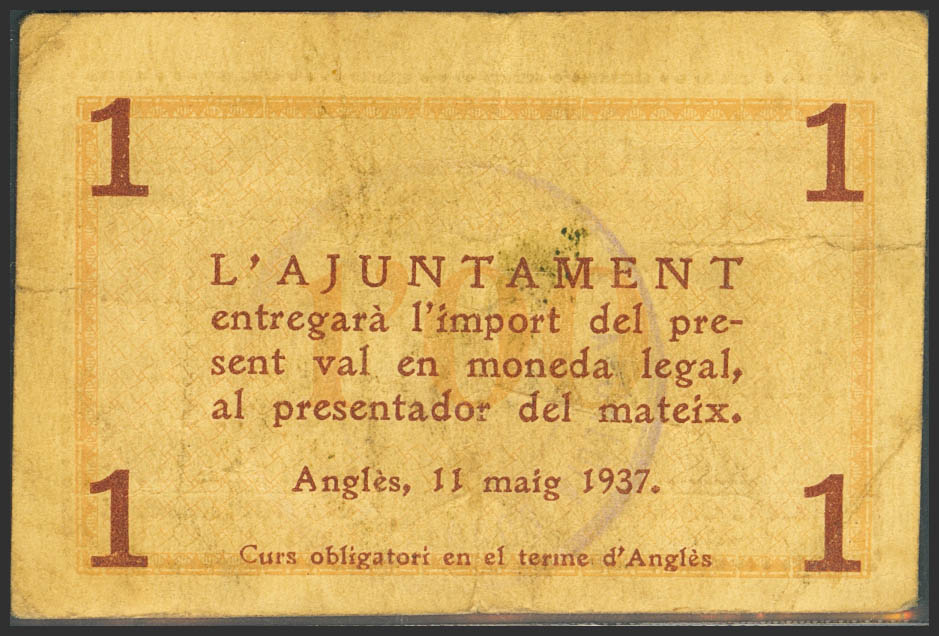 ANGLES (GERONA). 1 Peseta. May 11, 1937. Series A. (González: 6288). Unusual. Very Fine-.