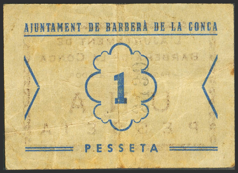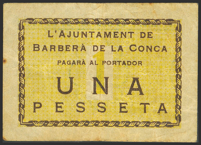 BARBERA DE LA CONCA (TARRAGONA). 1 Peseta. (circa 1937). (González: 6515). Very rare. VF-.