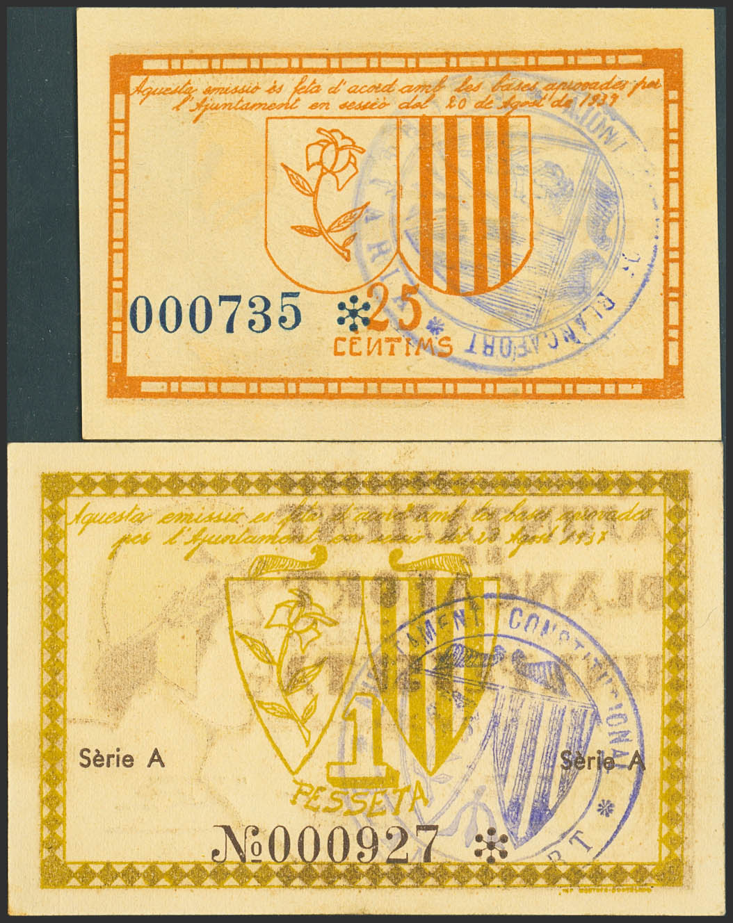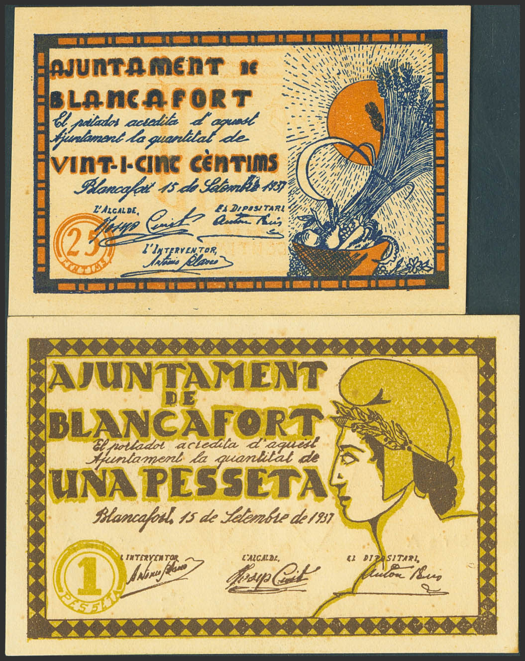 English BLANCAFORT (TARRAGONA). 25 Centimos and 1 Peseta. September 15, 1937. (González: 7102, 7104). Very rare, especially in this condition. EF+.