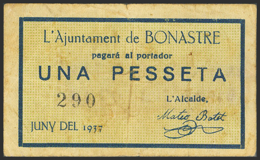 BONASTRE (TARRAGONA). 1 Peseta. June 1937. (González: 7127). Queer. Very Fine-.