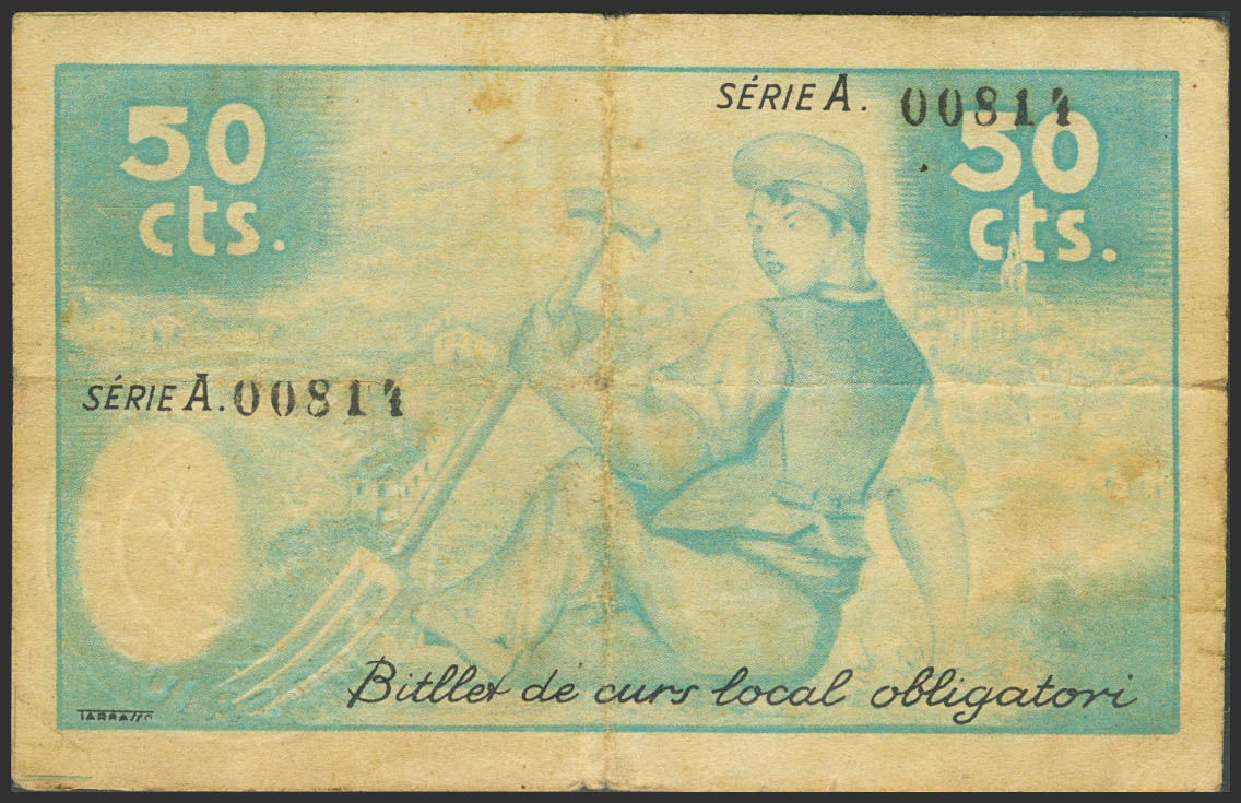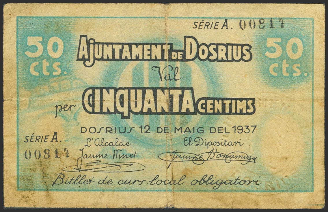 DOSRIUS (BAGoodELONA). 50 Centimos. May 12, 1937. Series A. (González: 7721). Rare. VF-.