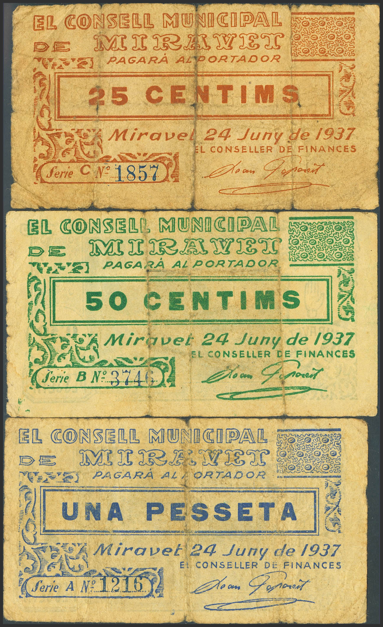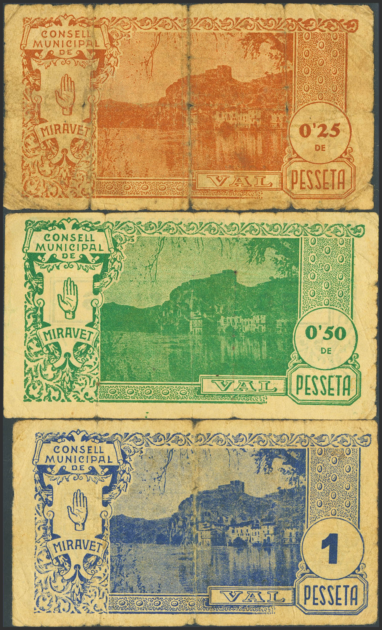 English MIRAVET (TARRAGONA). 25 Cents, 50 Cents and 1 Peseta. June 24, 1937. (González: 8684/86). Rare complete series. Fine.