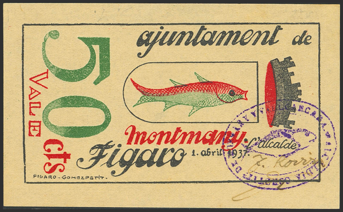 MONTMANY (BAGoodELONA). 50 Centimos. April 1, 1937. (González: 8798). Rare, especially in this condition. Uncirculated--.