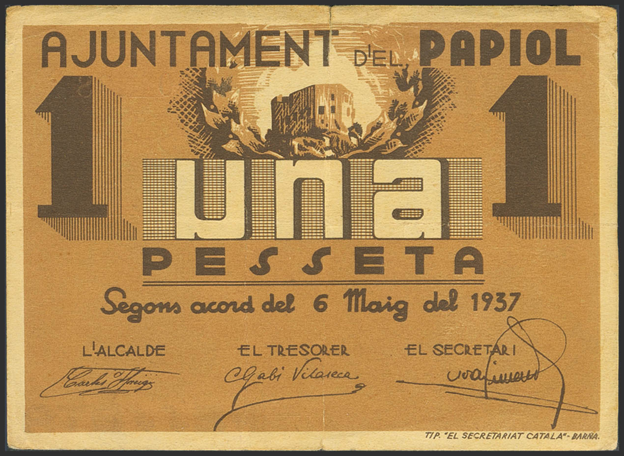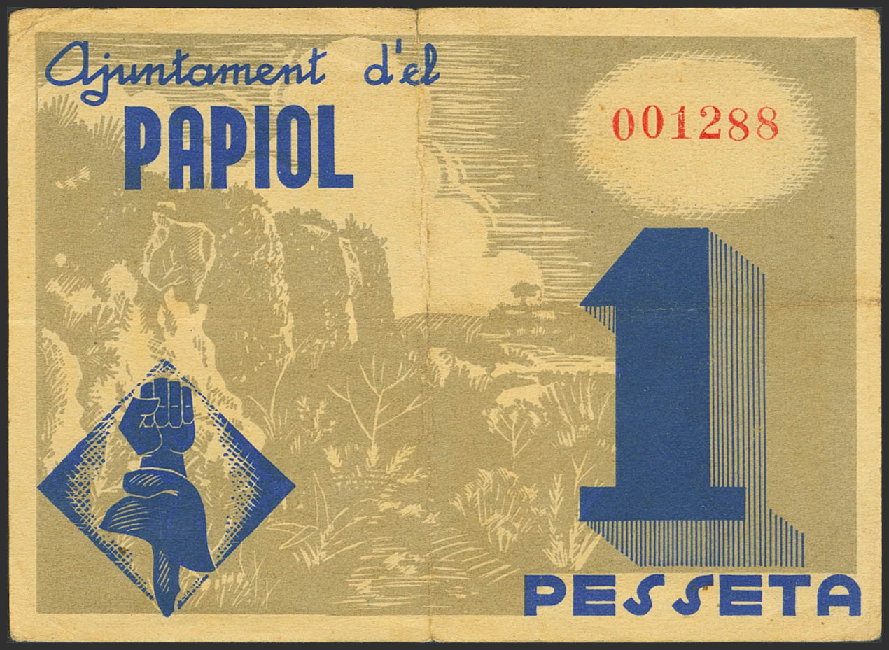 English PAPIOL (BAGoodELONA). 1 Peseta. May 6, 1937. (González: 9151). Unusual. Very Fine-.