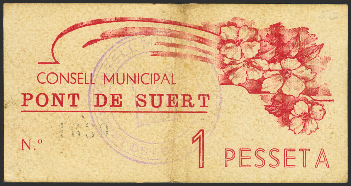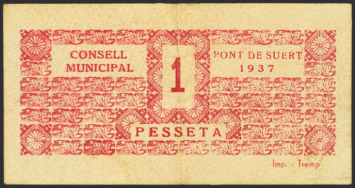 PONT DE SUERT (LERIDA). 1 Peseta. 1937. (González: 9384). Rare. VF-.