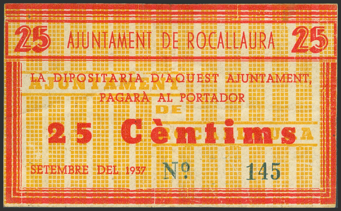 ROCALLAURA (LERIDA). 25 Centimos. September 1937. (González: 9711). Rare. VF.
