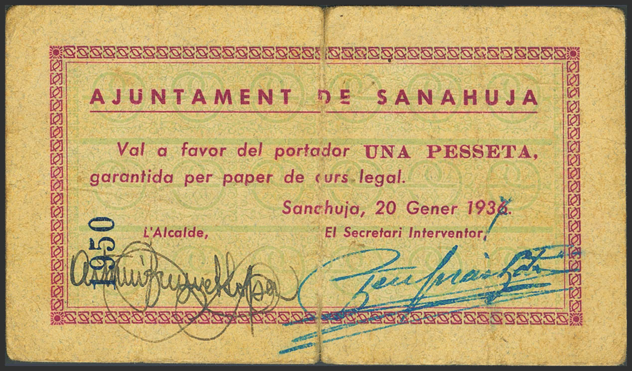 English SANAHUJA (LERIDA). 1 Peseta. January 20, 1937. (González: 9845a). Very rare. Very Fine-.