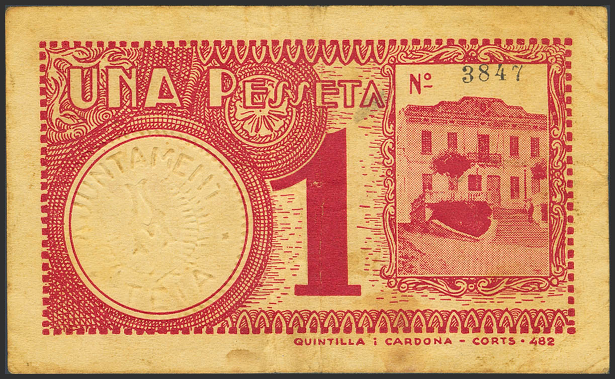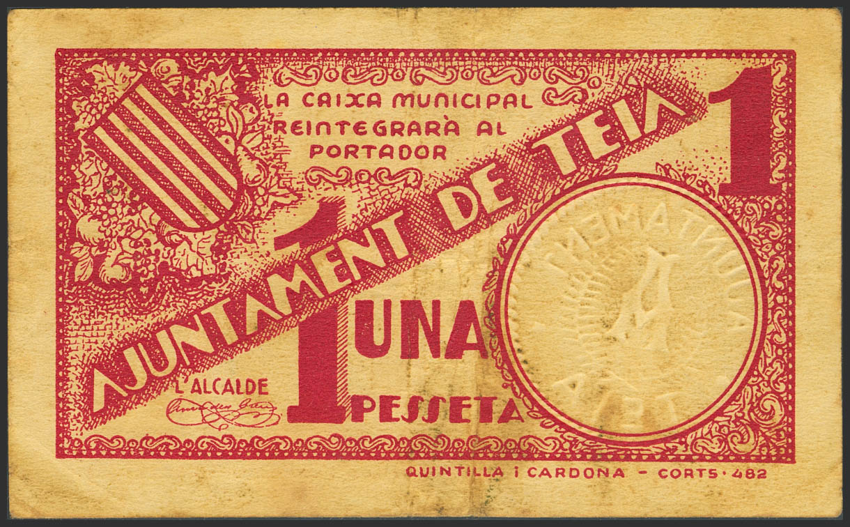 English TEIA (BAGoodELONA). 1 Peseta. (1937ca). (González: 10124). Unusual. Very Fine-.