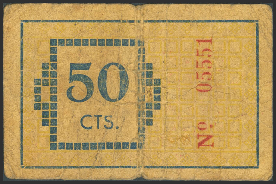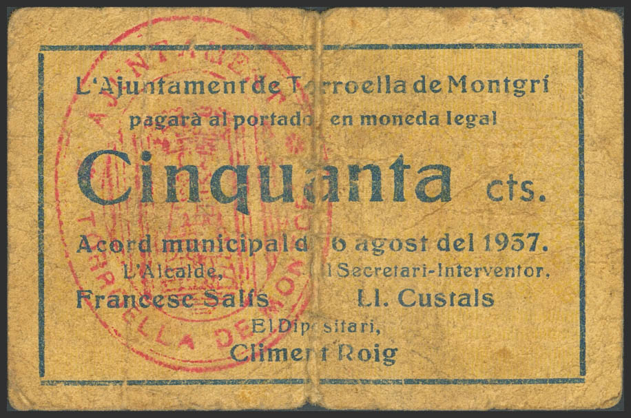 TORROELLA DE MONTGRI (GERONA). 50 Cents. August 6, 1937. (González: 10394). Unusual. Fine-.