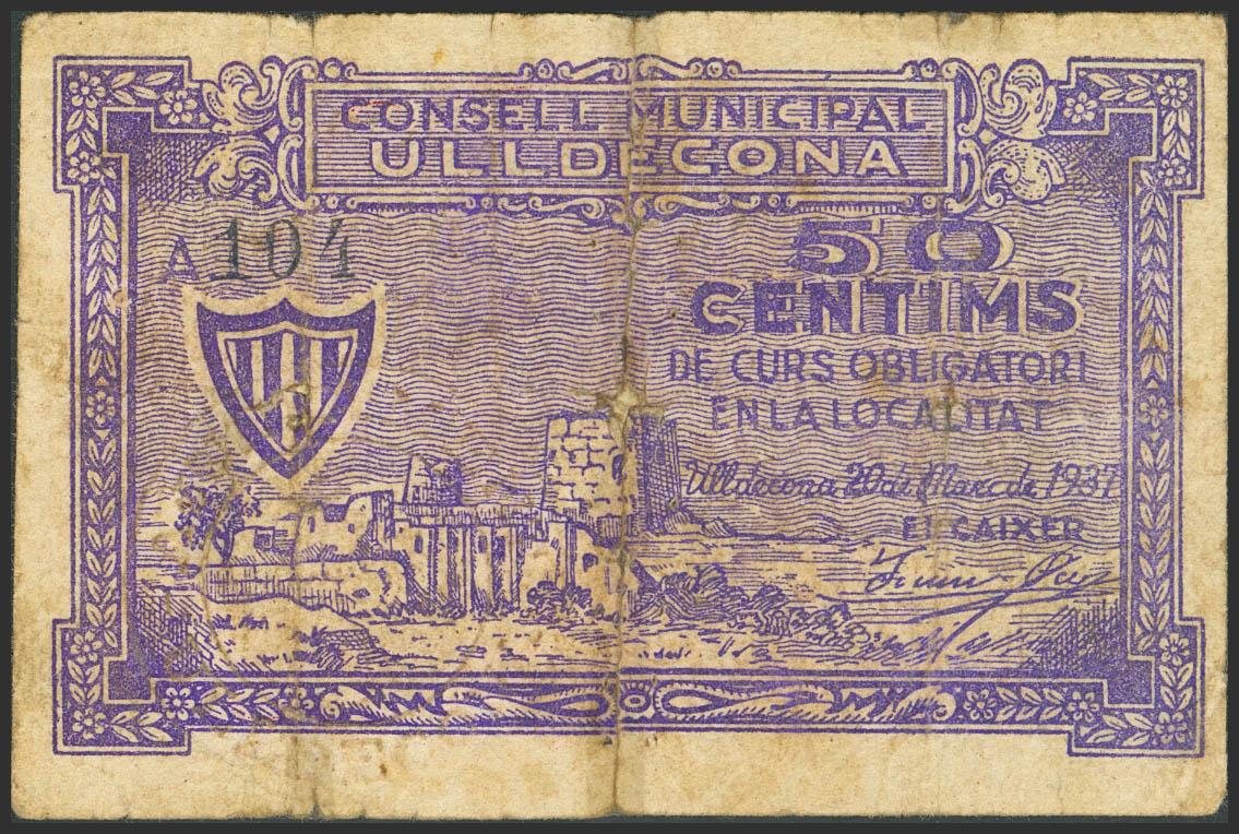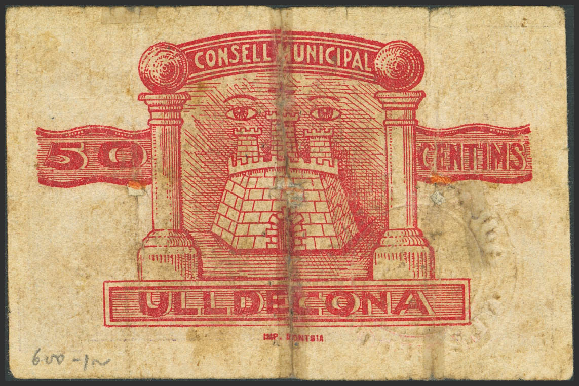 ULLDECONA (TARRAGONA). 50 Cents. May 20, 1937. (González: 10452). Unusual. Fine-.