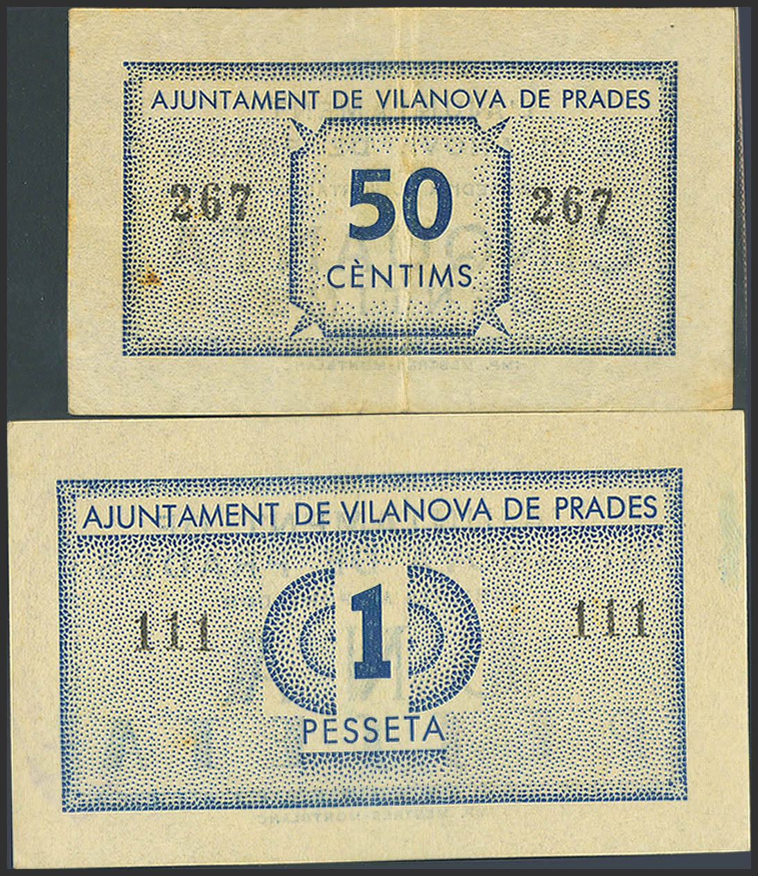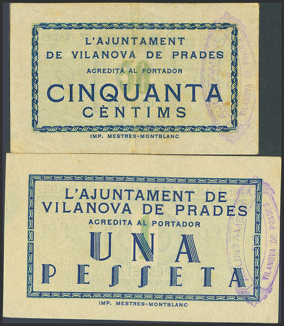 VILANOVA DE PRADES (TARRAGONA). 50 Cents and 1 Peseta. (1937ca). (González: 10820, 10821). Very rare. Extremely Fine-/Uncirculated-.