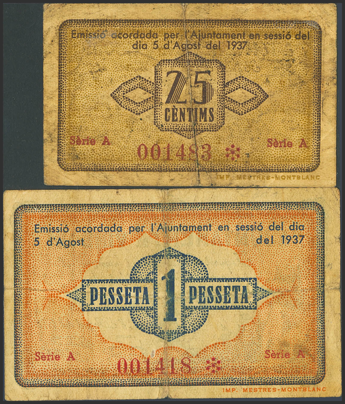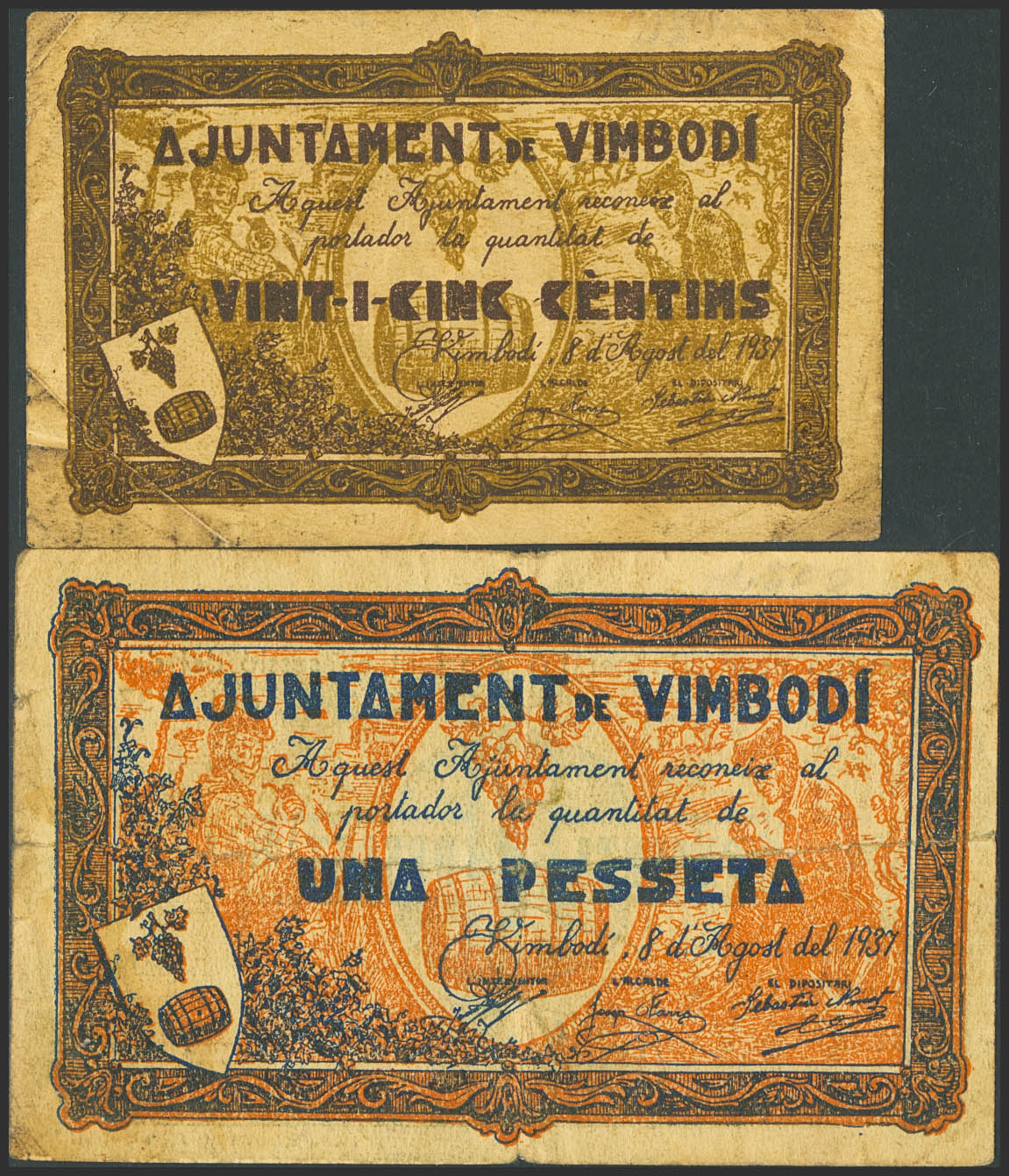 VIMBODI (TARRAGONA). 25 Centimos and 1 Peseta. August 8, 1937. (González: 10905, 10907). Unusual. Very Fine-.