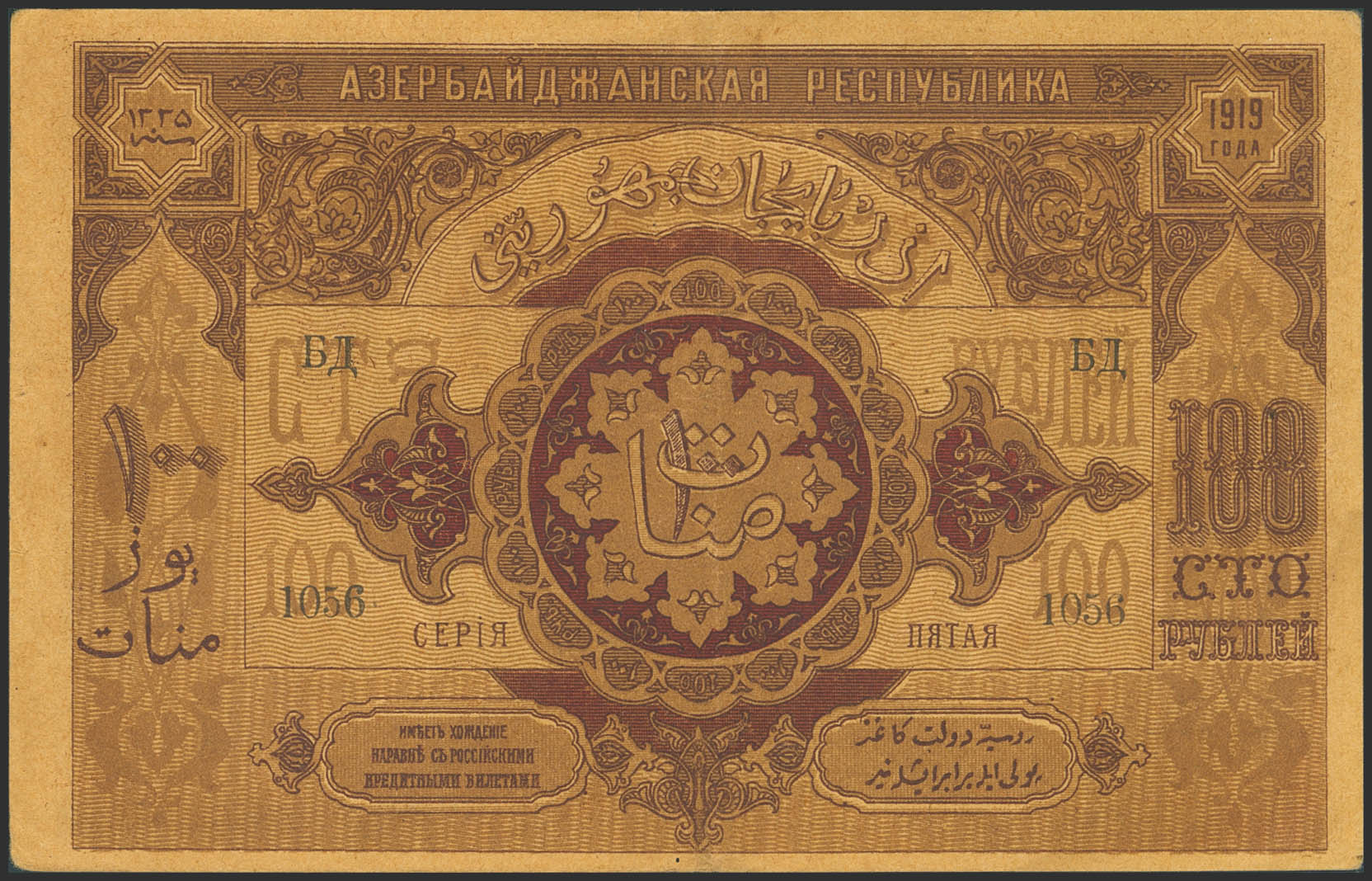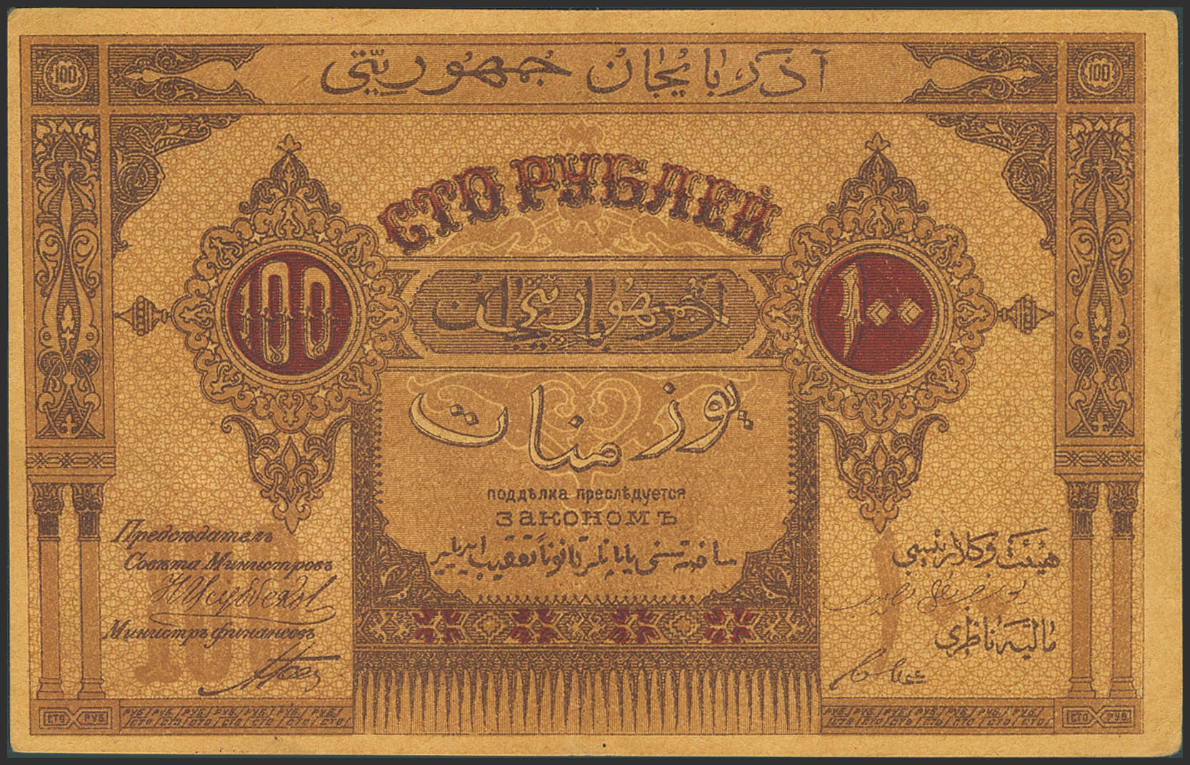 English AZERBAIJAN. 100 Rubley. 1919. Azerbaijanskaya Respublika. (Pick: 5). More than Extremely Fine.
