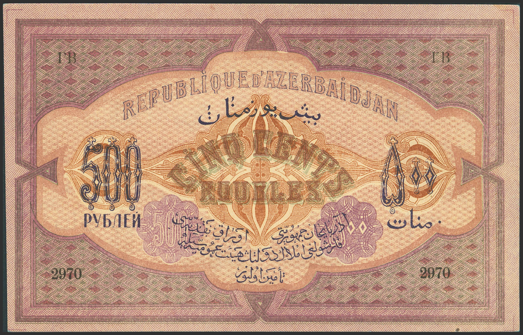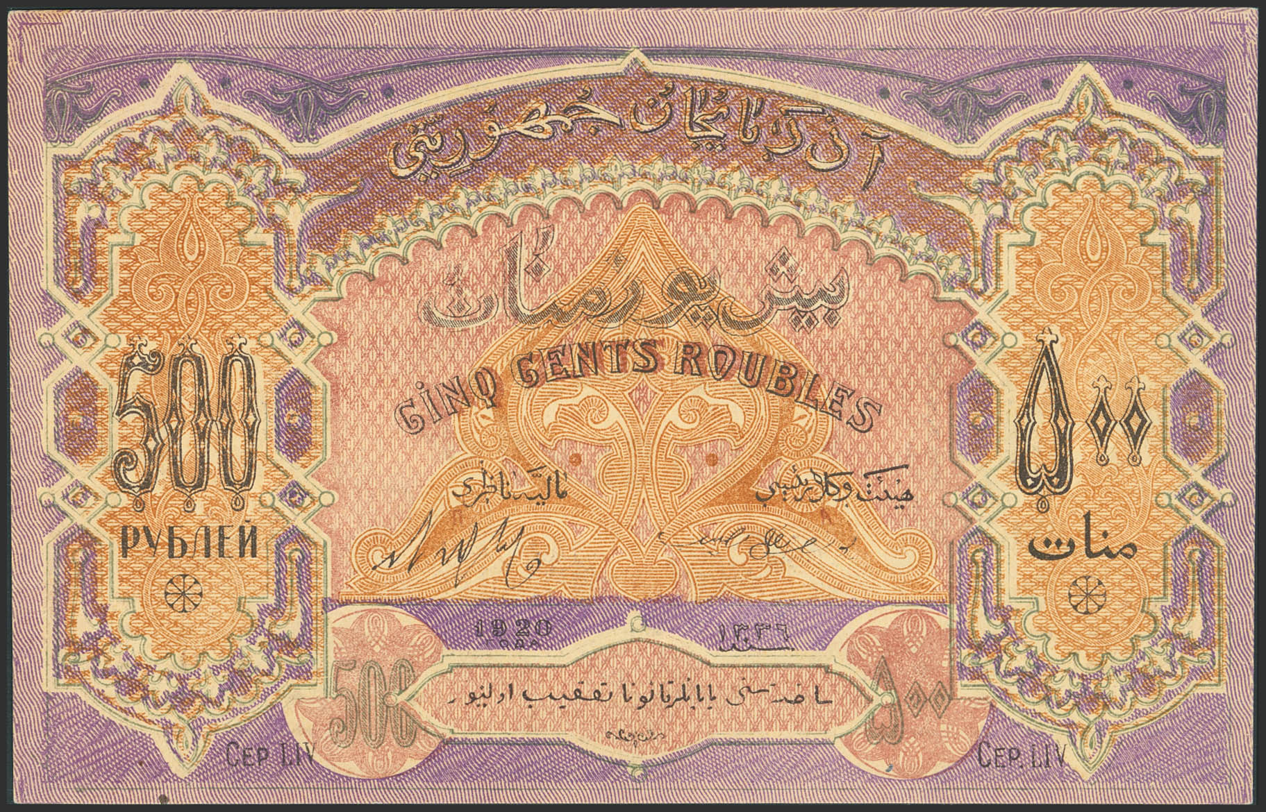 AZERBAIJAN. 500 Rubley. 1920. Azerbaijanskaya Respublika. (Pick: 7). Less than Uncirculated.