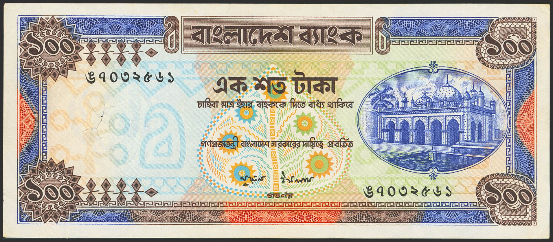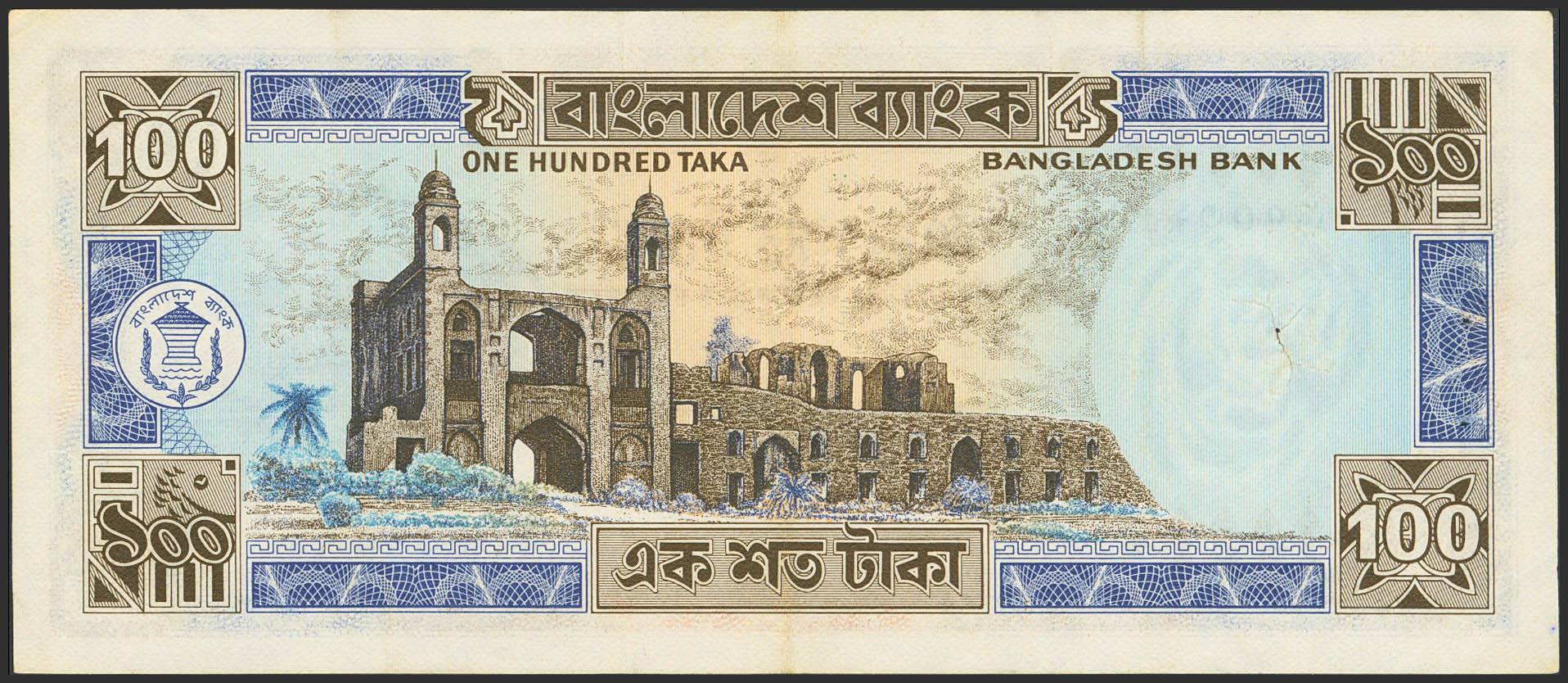 English BANGLADESH. 100 Taka. (1977ca). Bangladesh Bank. (Pick: 24). Spindle hole in watermark area. Very Fine.