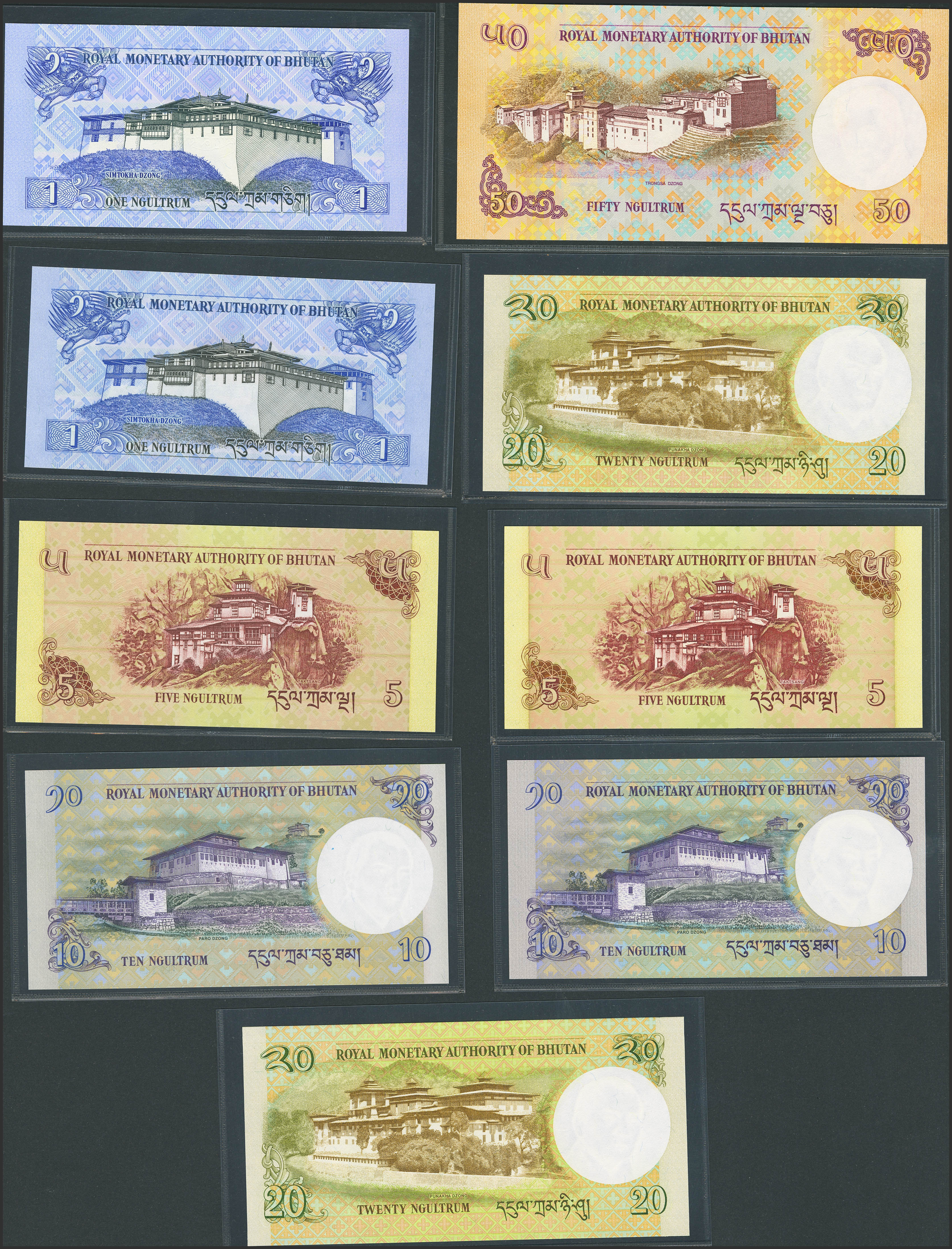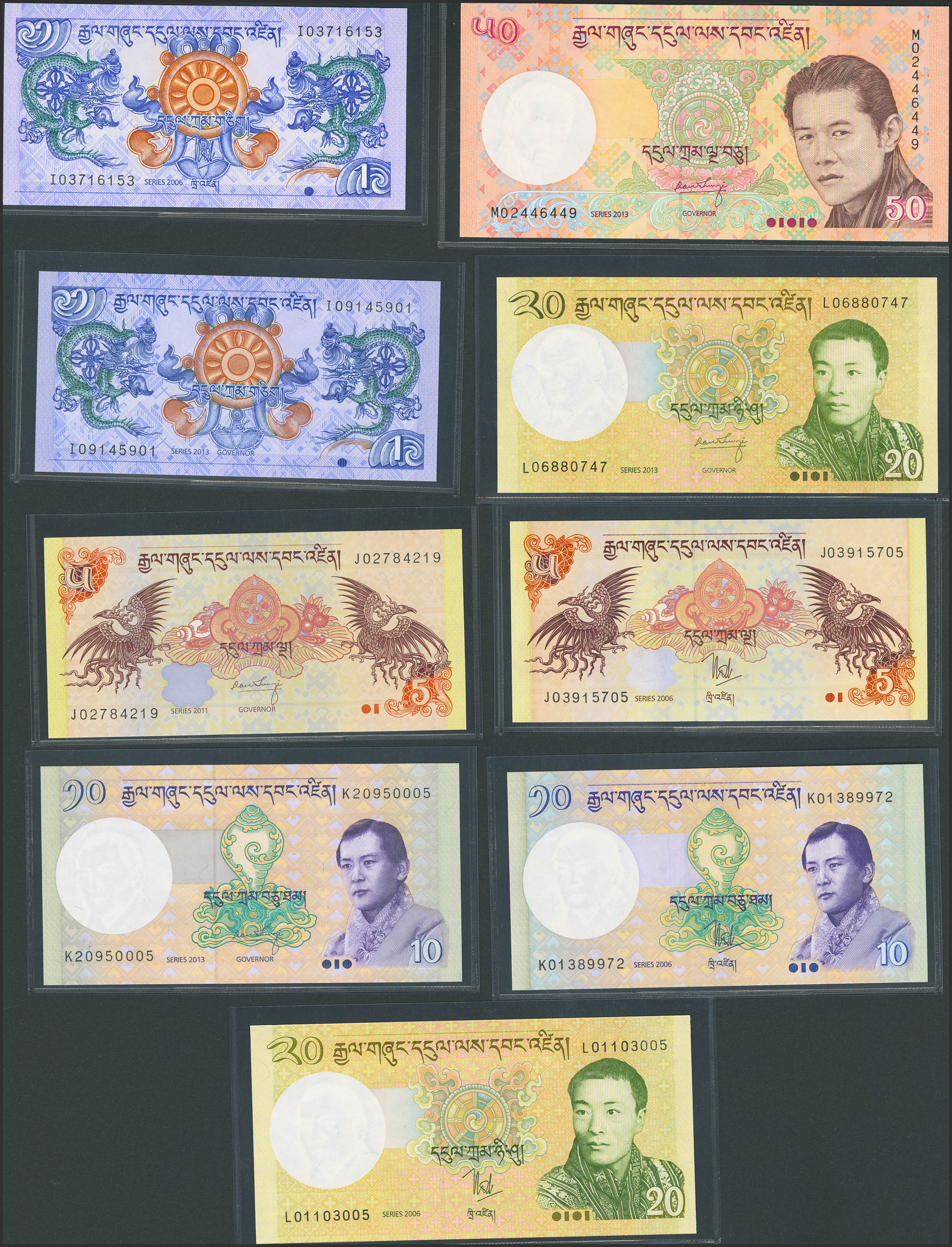 BHUTAN. Lot of 9 notes from 1 to 50 Ngultrum. 2006-2013. Royal Monetary Authority. (Pick: 27a, 27b, 28a, 28b, 29a, 29b, 30a, 30b, 31b). Uncirculated.