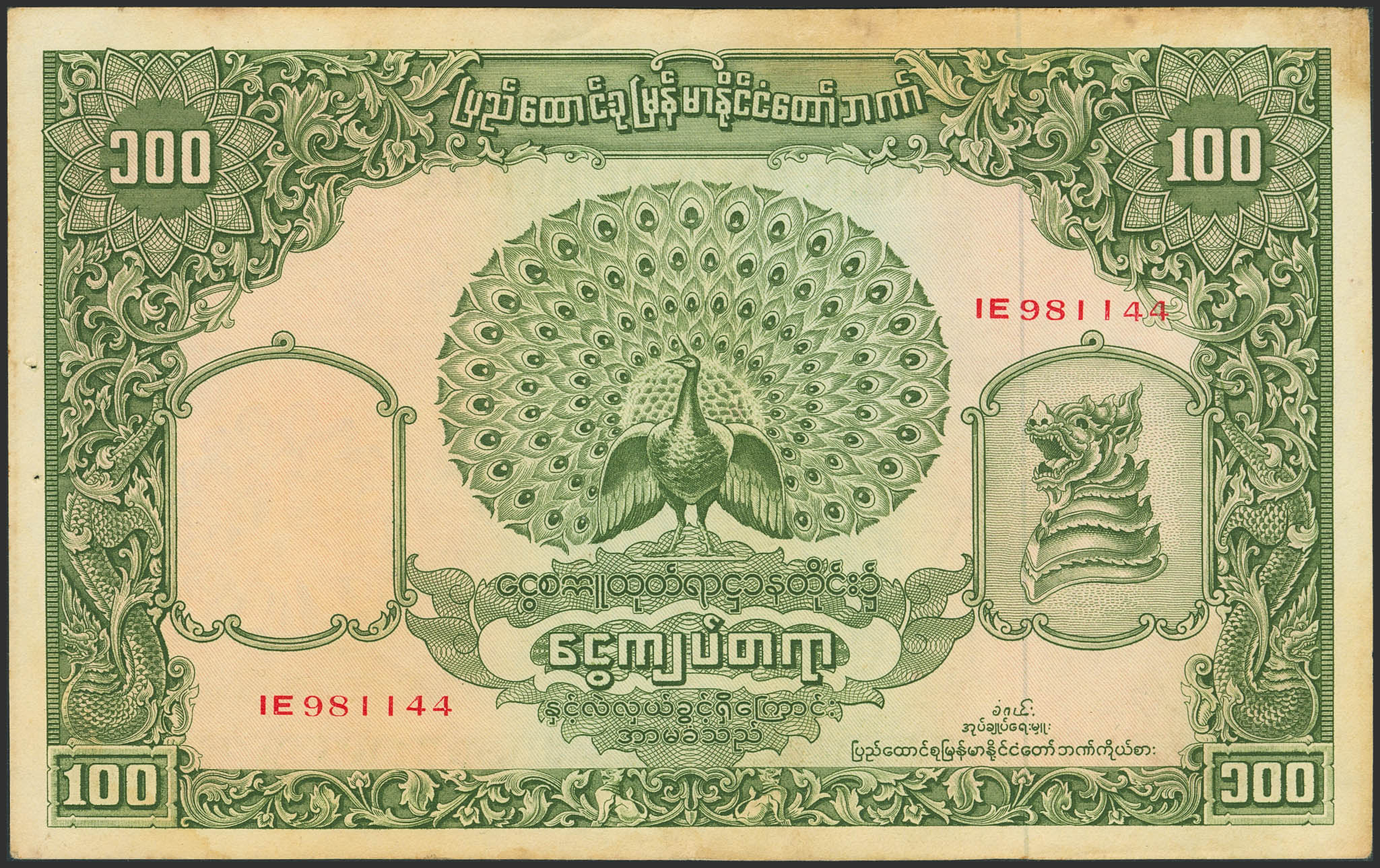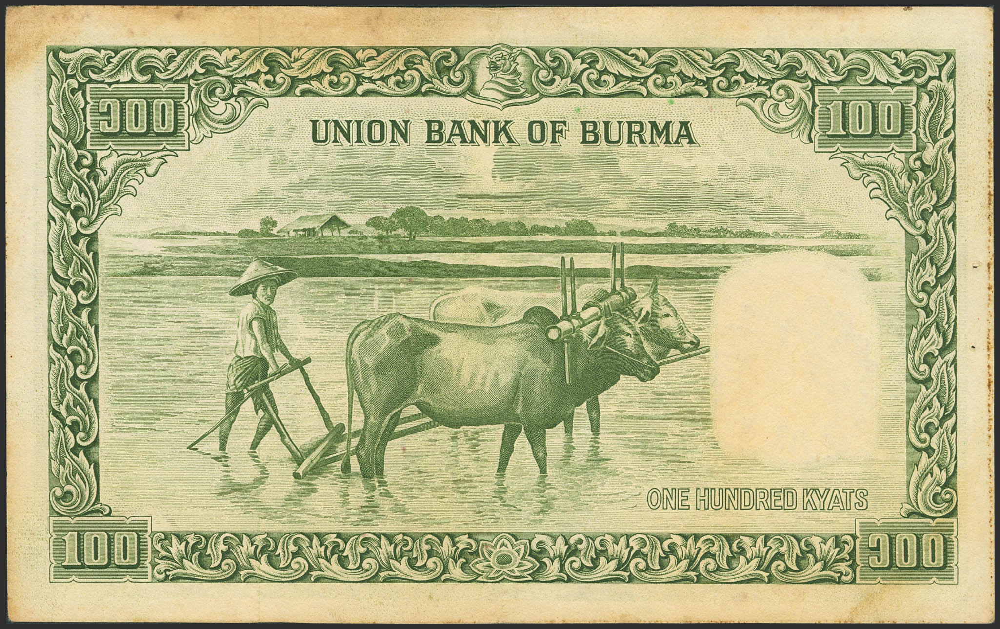 BURMA. 100 Kyats. (1953ca). Union Bank. (Pick: 45). About Uncirculated, staple holes at Issue.