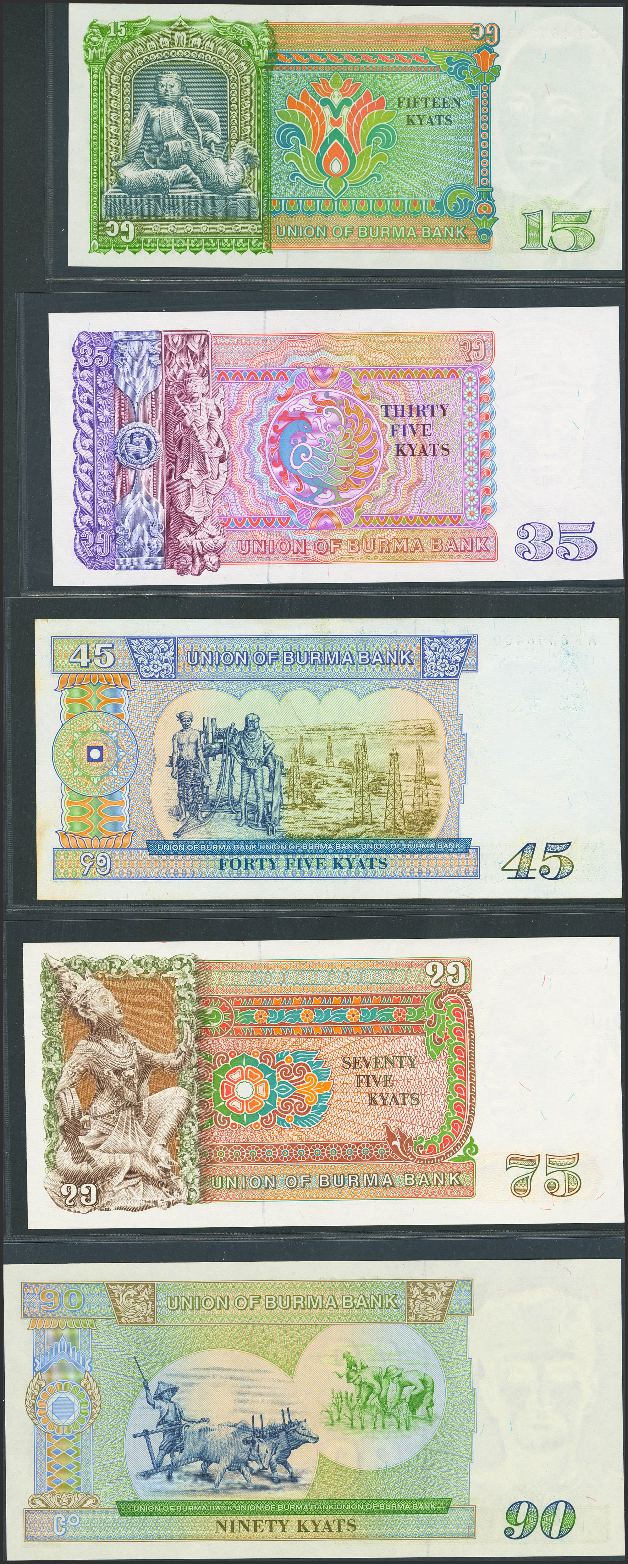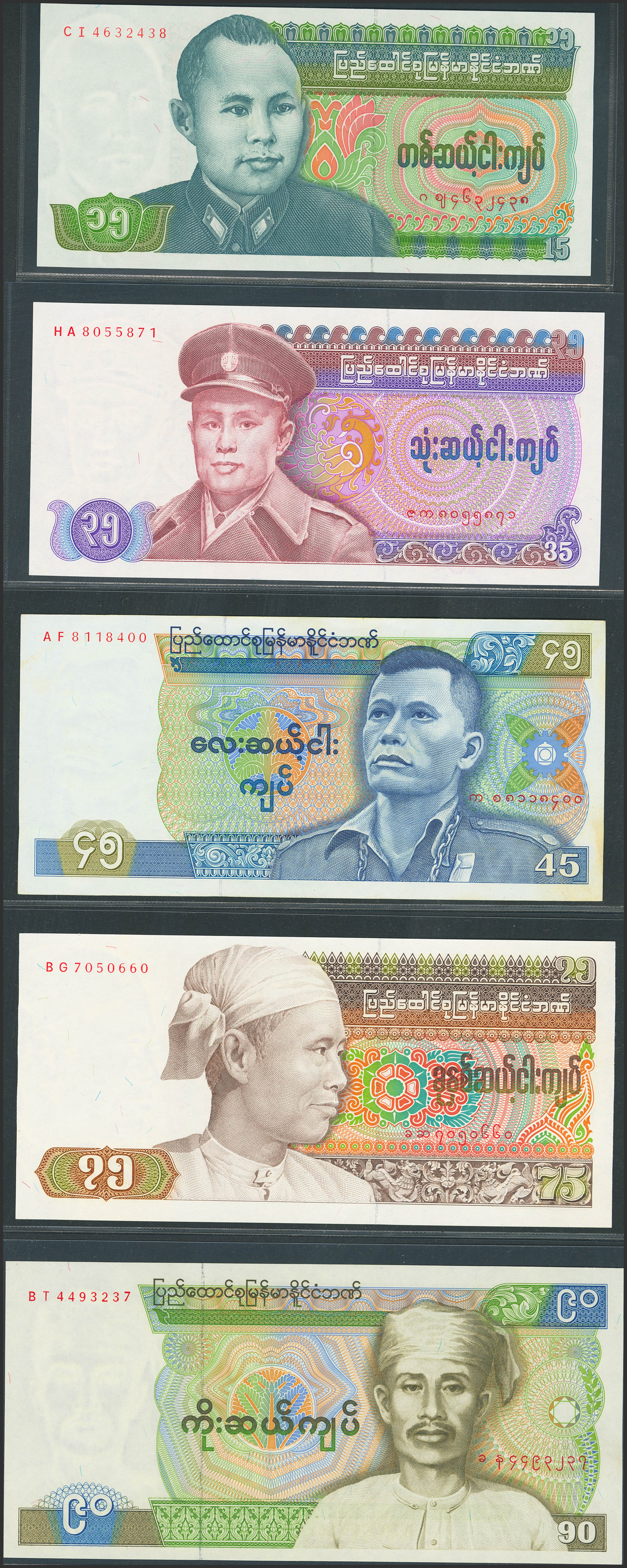 BURMA. Complete Set from 15 at 90 Kyats. (1986ca). Union of Burma Bank. (Pick: 62, 63, 64, 65, 66). Uncirculated.