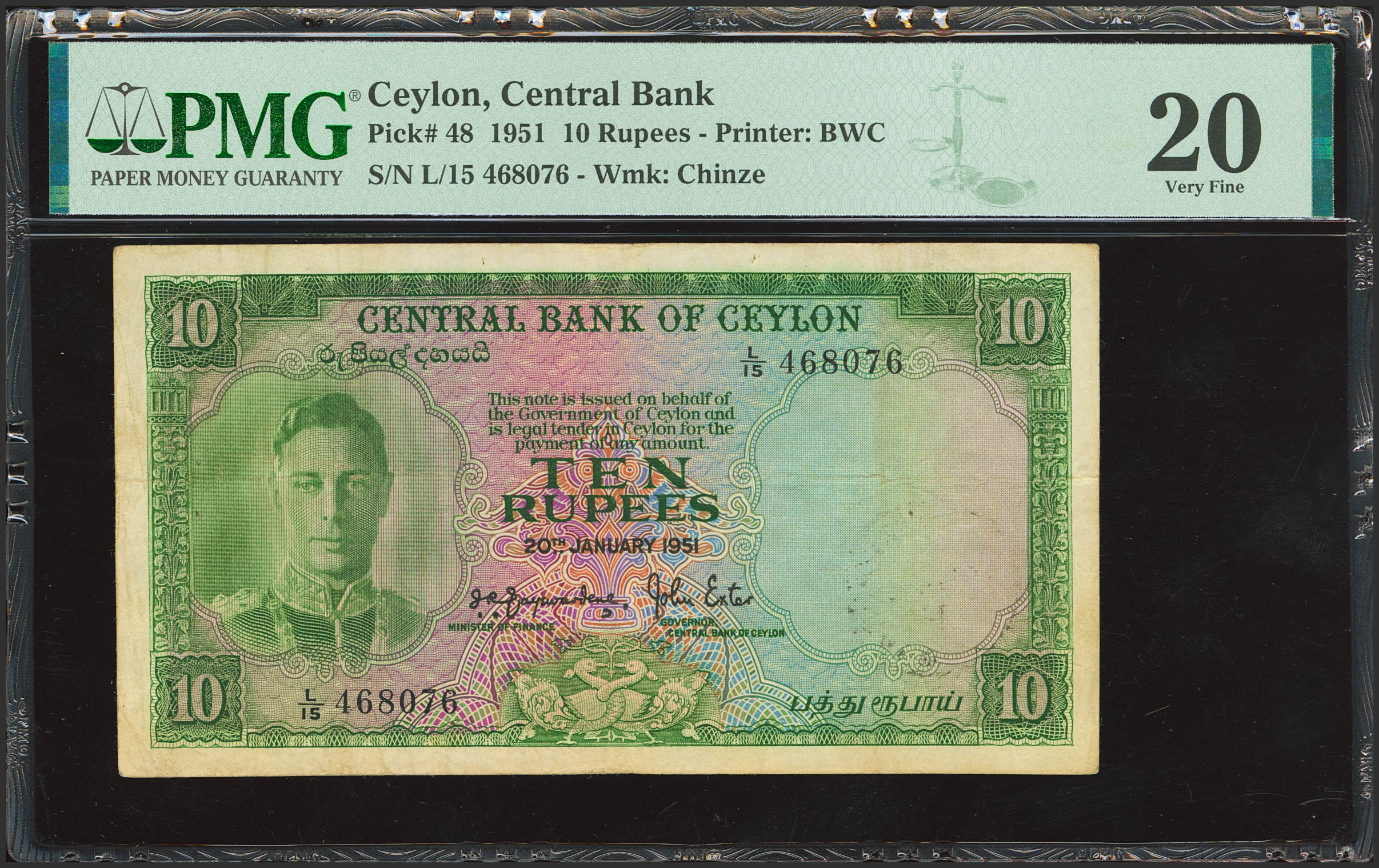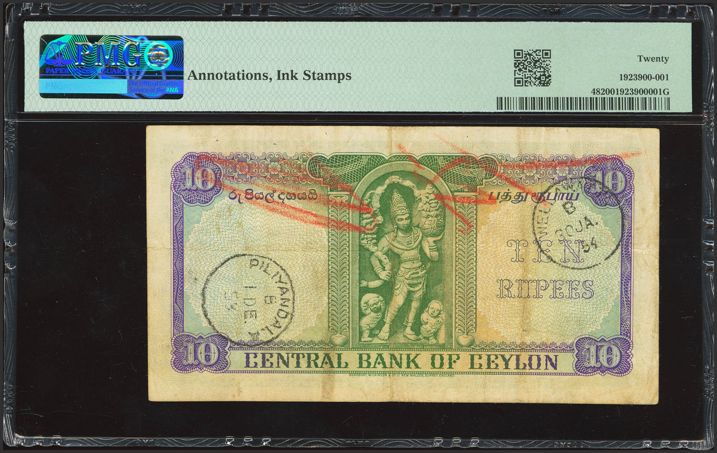 English CEYLON. 10 Rupees. January 20, 1951. Central Bank. (Pick: 48). PMG20 (annotations, ink stamps).