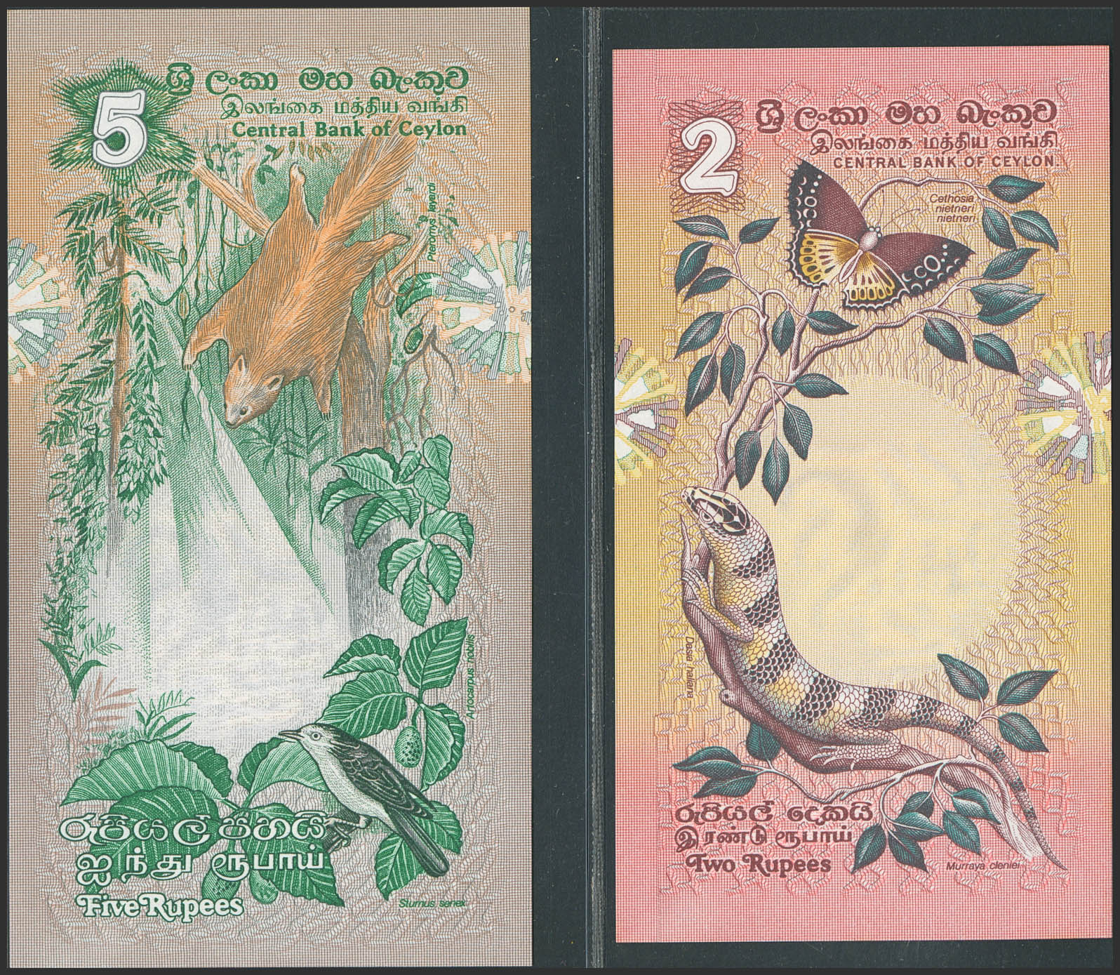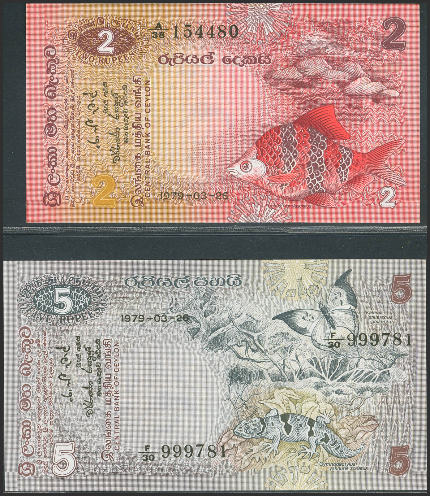 CEYLON. Lot of 2 notes of 2 and 5 Rupees. March 26, 1979. Central Bank. (Pick: 83a, 84a). Uncirculated.