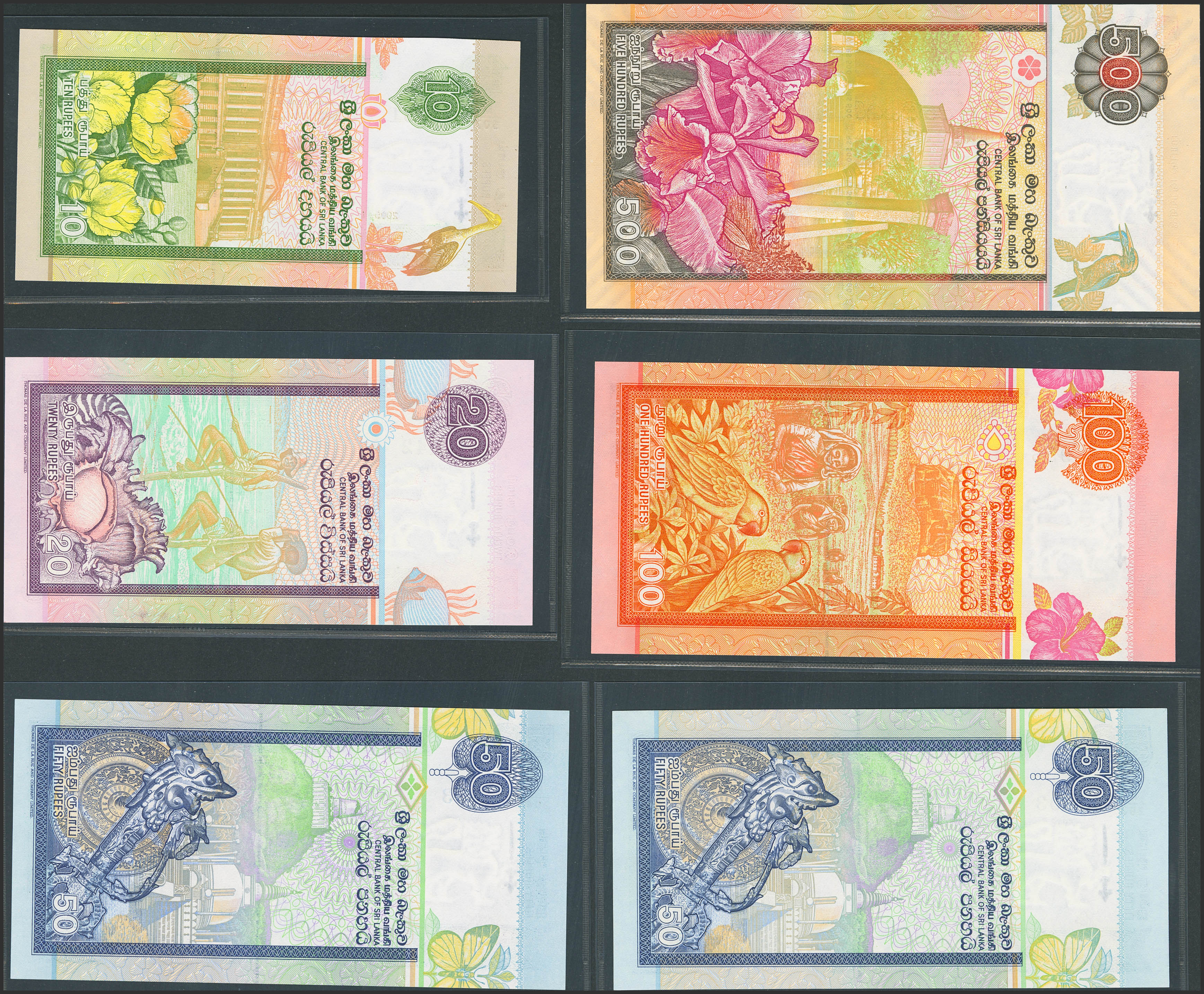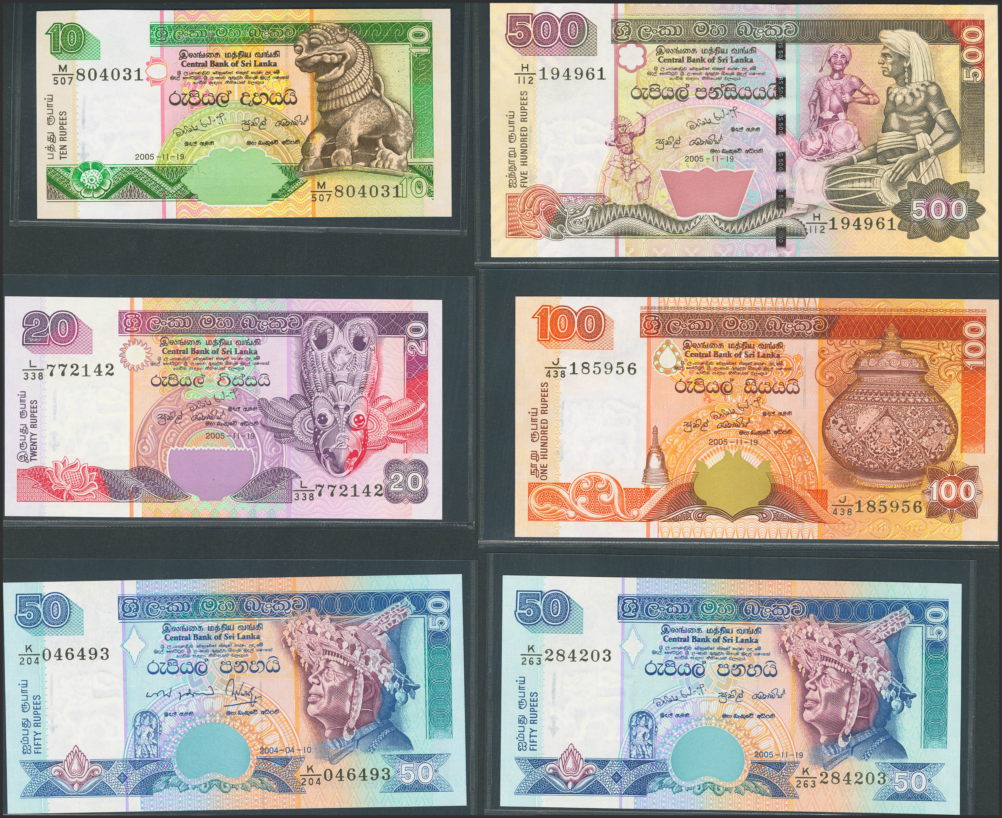 SRI LANKA. Lot of 6 notes from 10 at 500 Rupees. (2004ca). Central Bank. (Pick: 108e, 109d, 110c, 110e, 111d, 119d). Uncirculated.