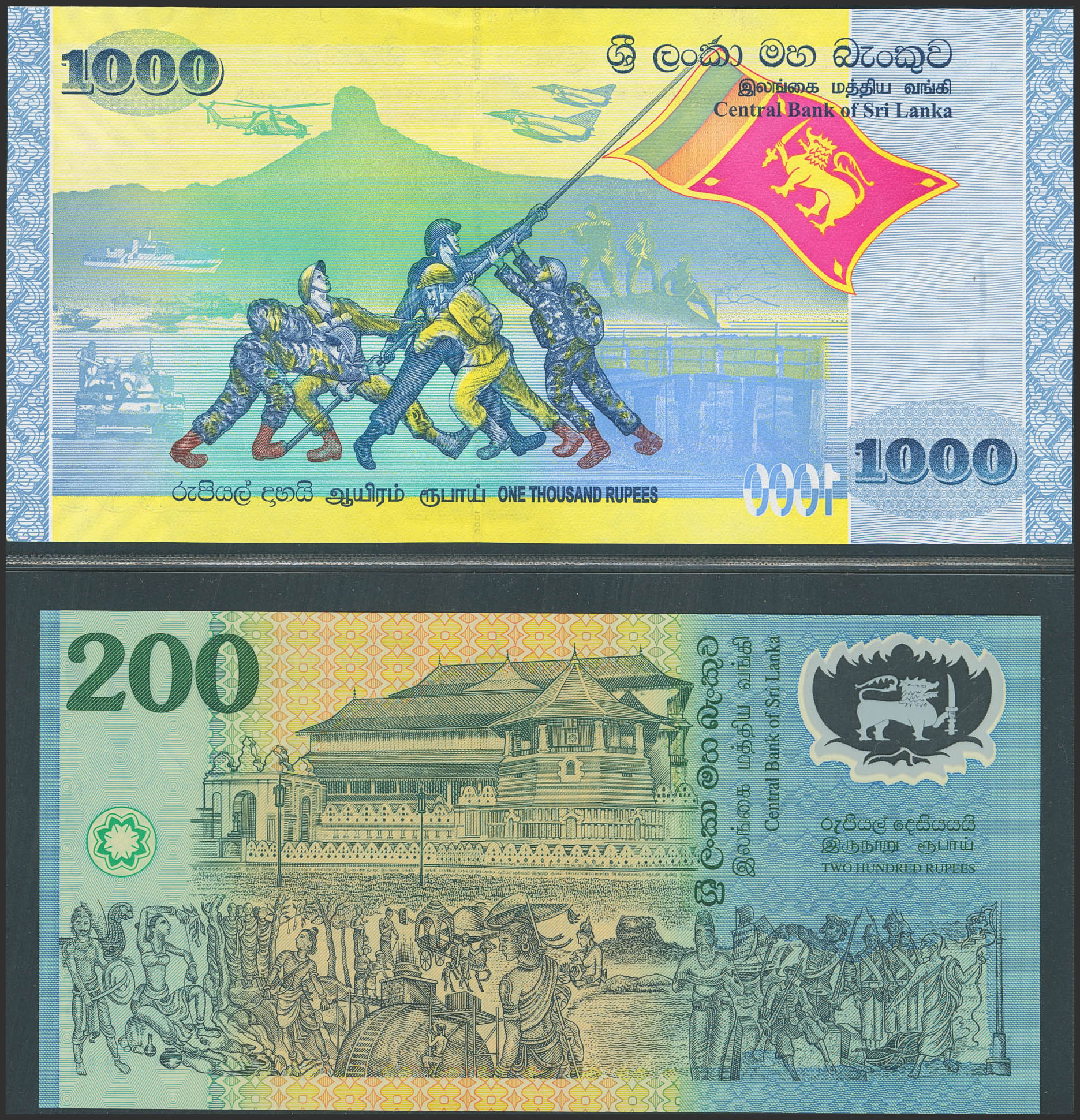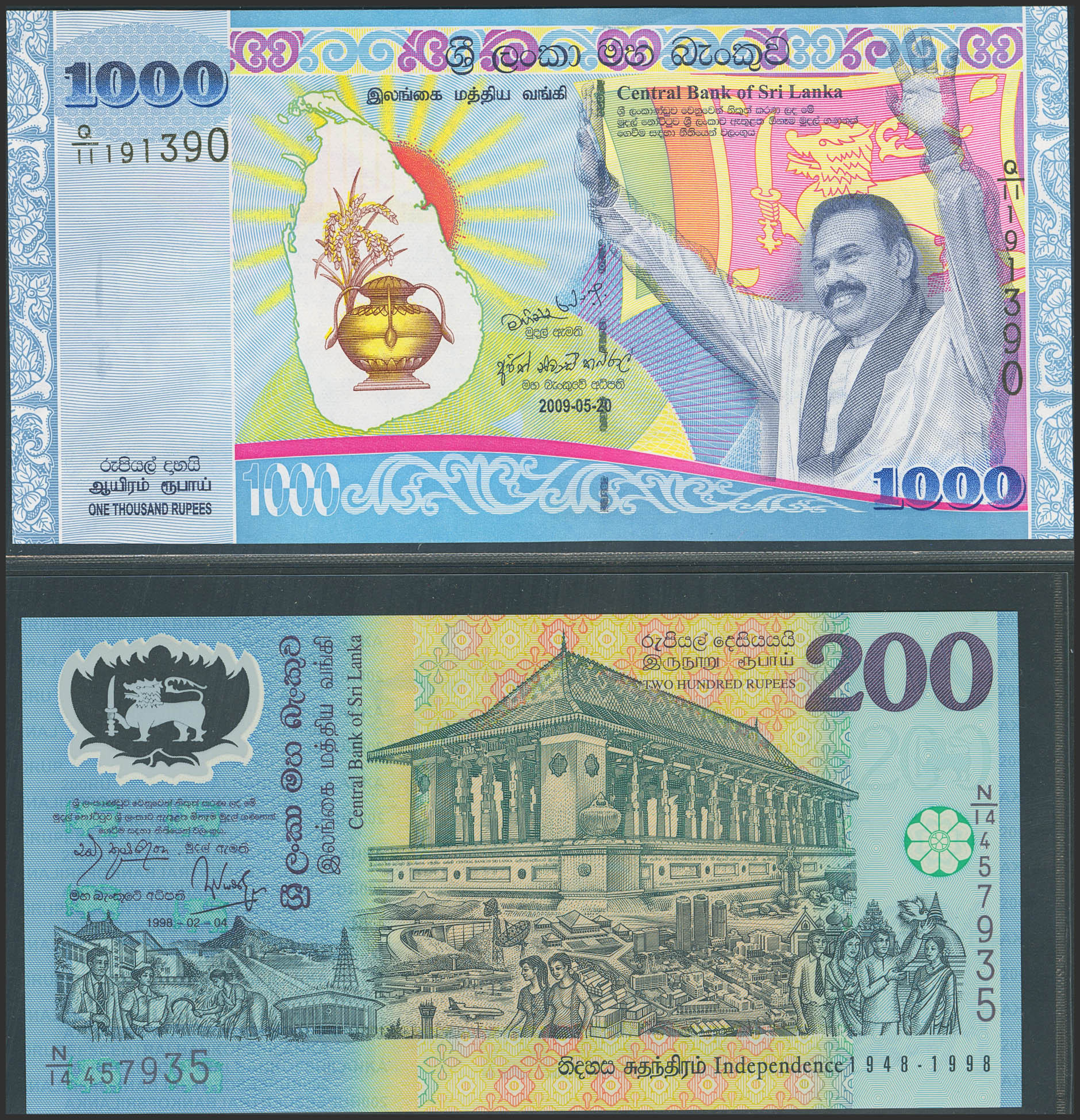 SRI LANKA. Lot of 2 commemorative notes of 200 and 1000 Rupees. (1998ca). Central Bank. Commemoration of the 50th anniversary of independence and peace and prosperity in Sri Lanka. (Pick: 114b, 122a). Uncirculated.
