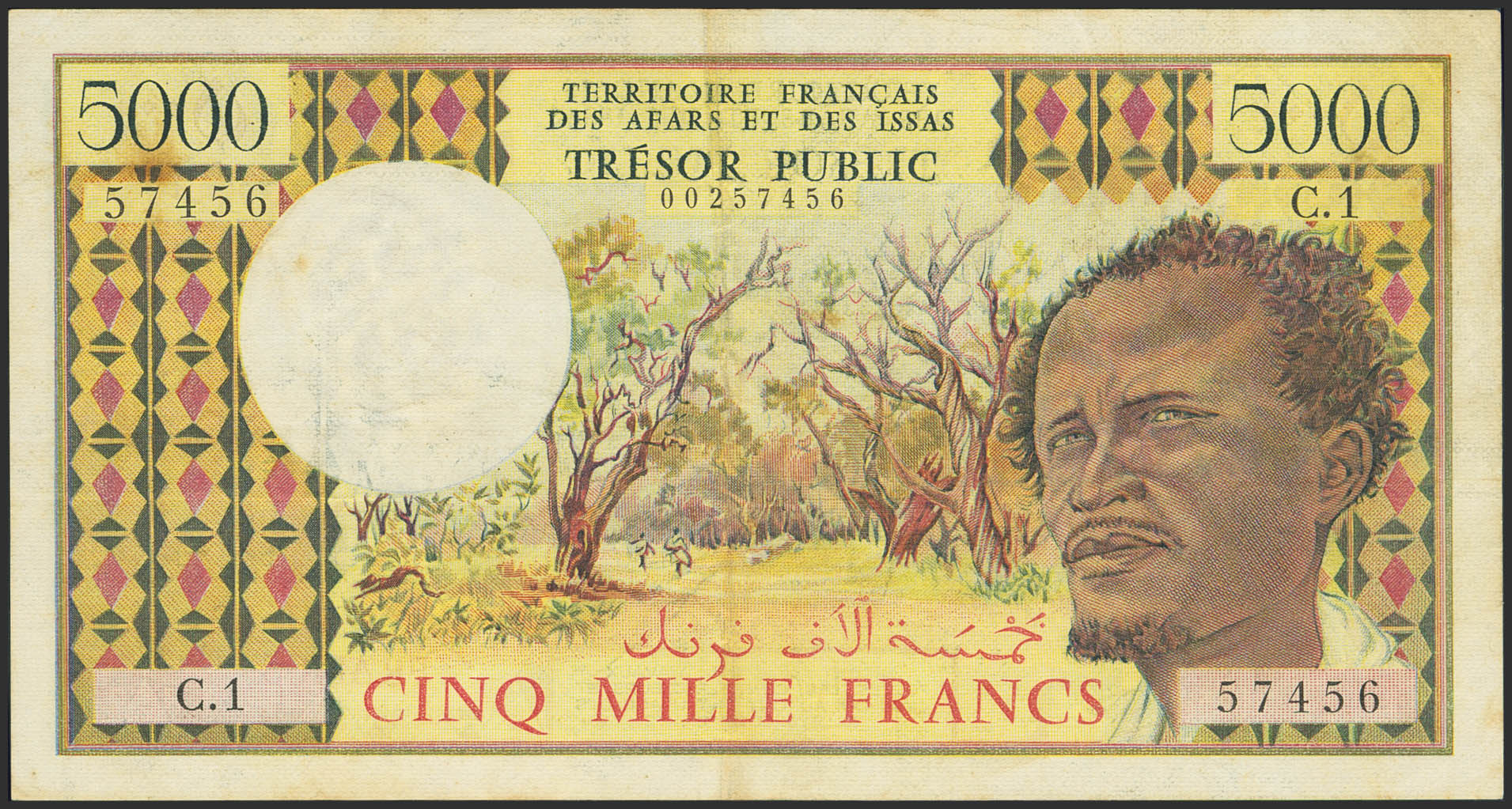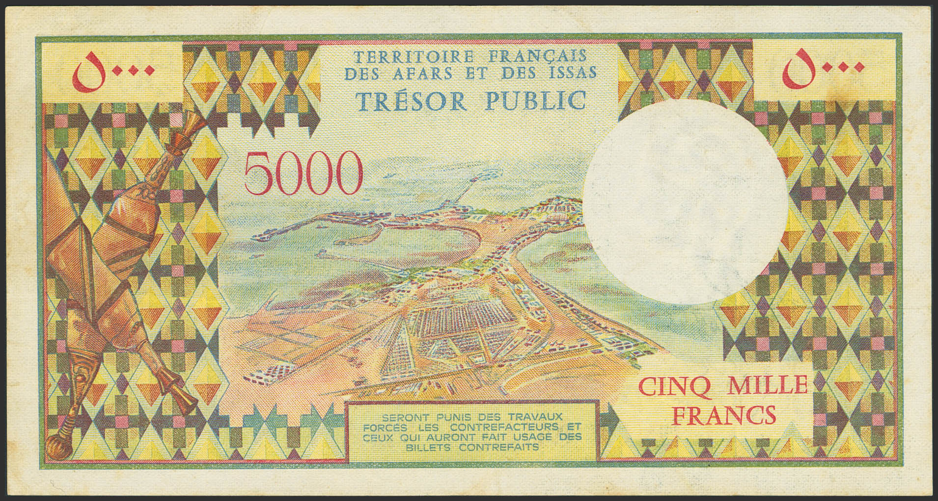 English DJIBOUTI-FRENCH AFARS AND ISSAS TERRITORY. 5000 Francs. (1975ca). Trésor Public. Territoire Français des Afars et des Issas. (Pick: 35). Very Fine.