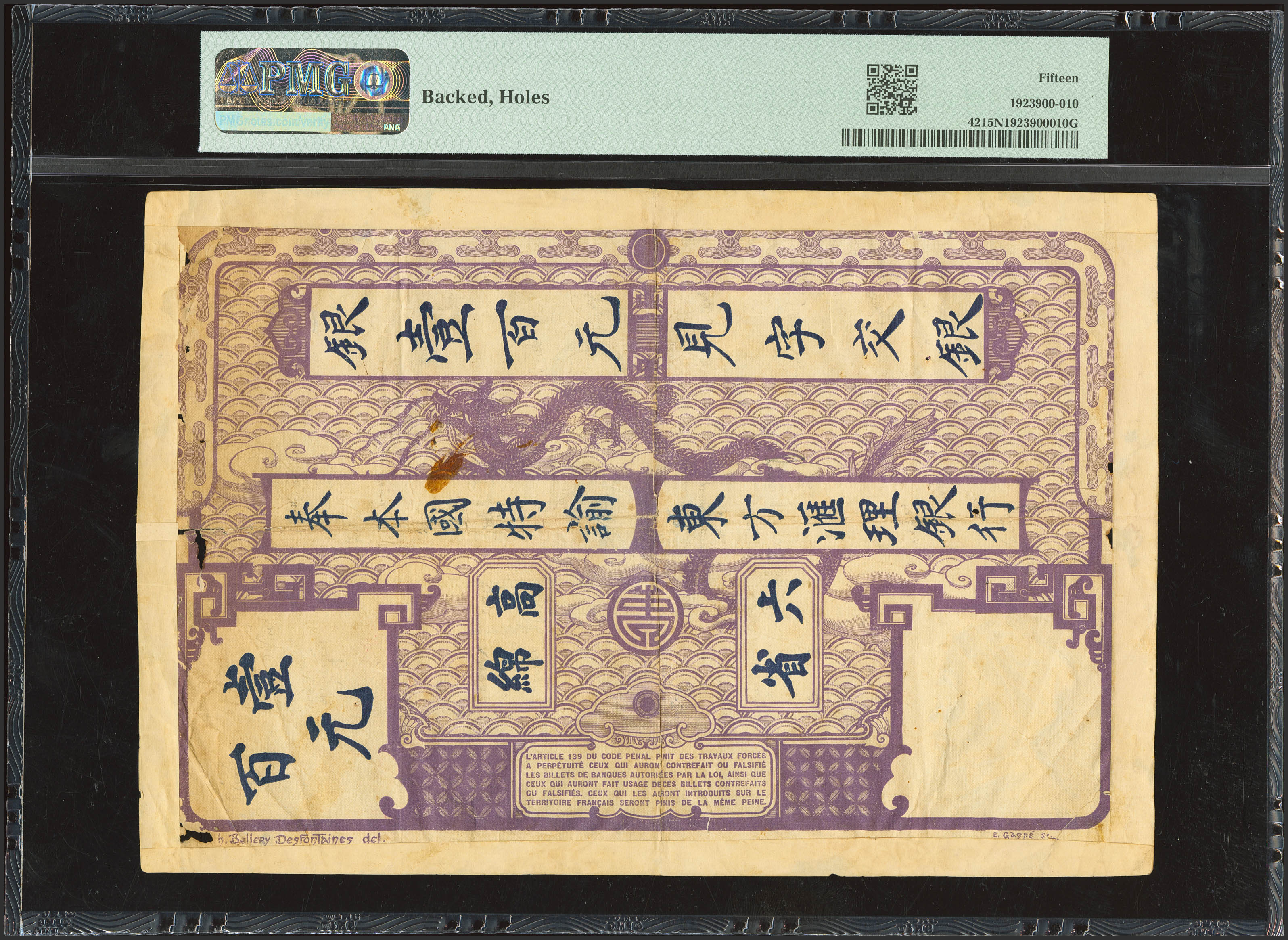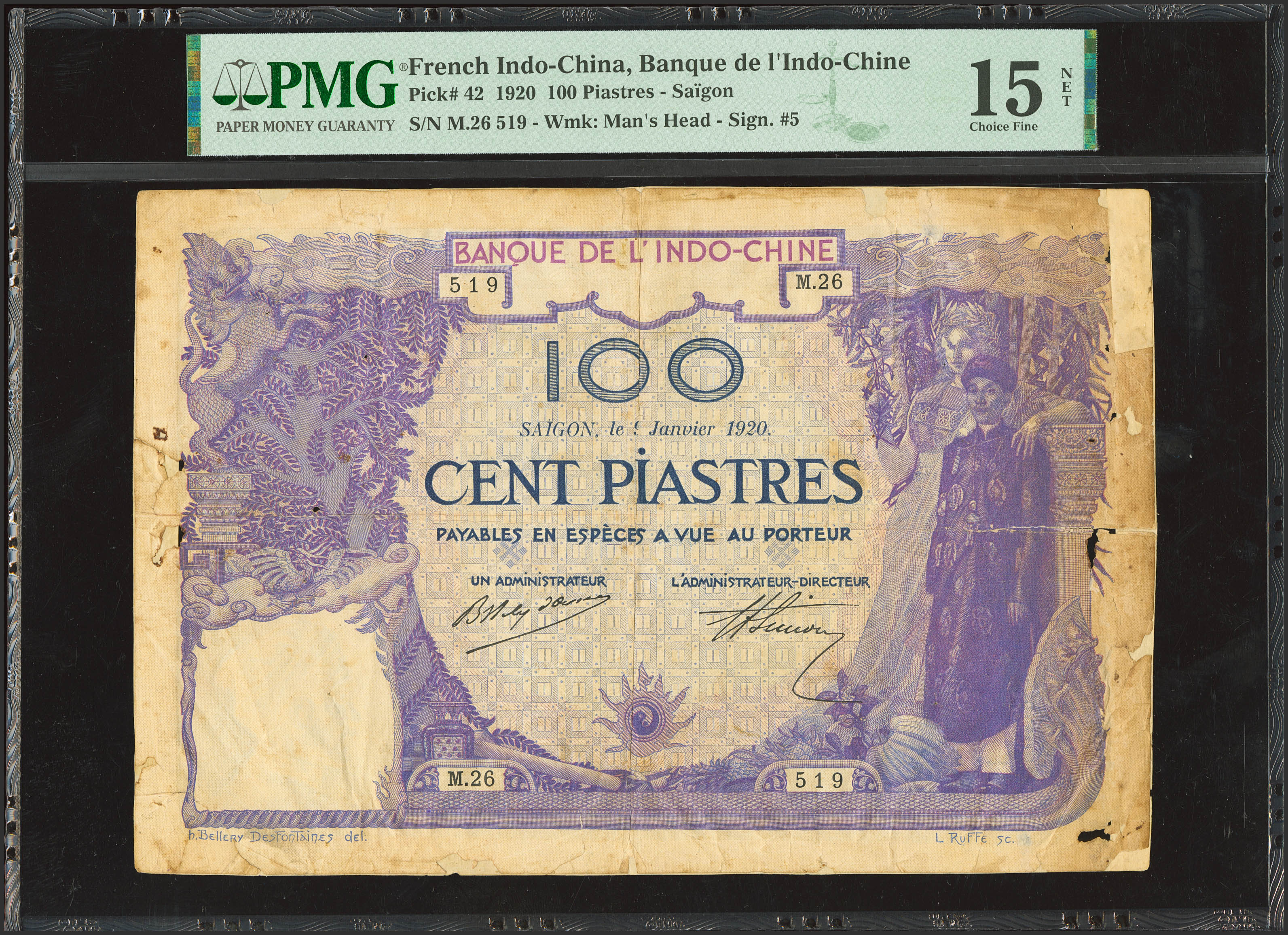 FRENCH INDOCHINA. 100 Piastres. 5 January 1920. Banque de L'Indochine. Saigon. (Pick: 42). PMG15NET (backed, holes).