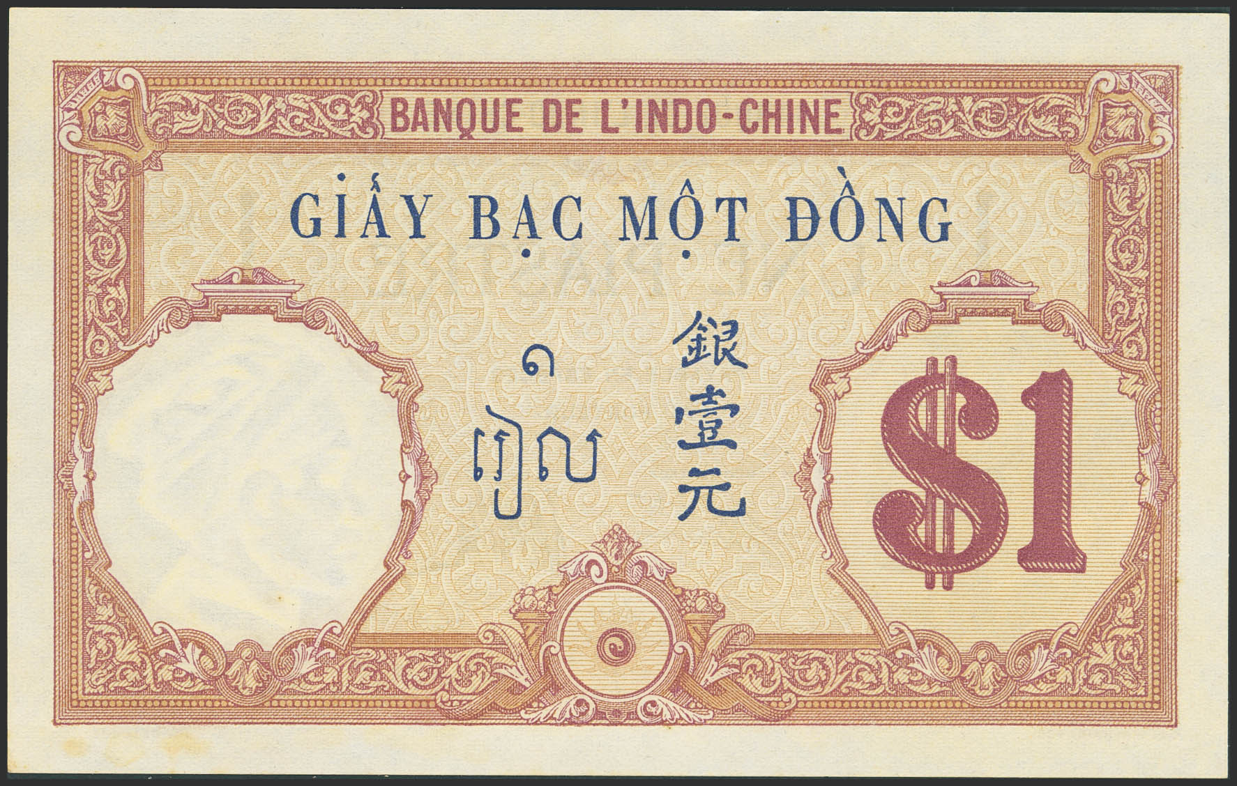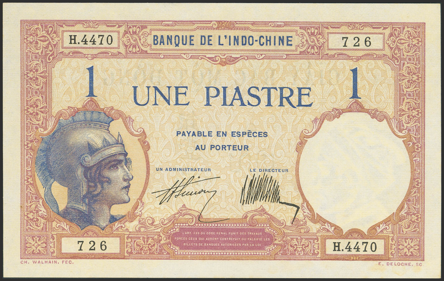 FRENCH INDOCHINA. 1 Piastre. (1921ca). Banque de L'Indo-Chine. (Pick: 48b). Less than Uncirculated, light stains on the lower edge.