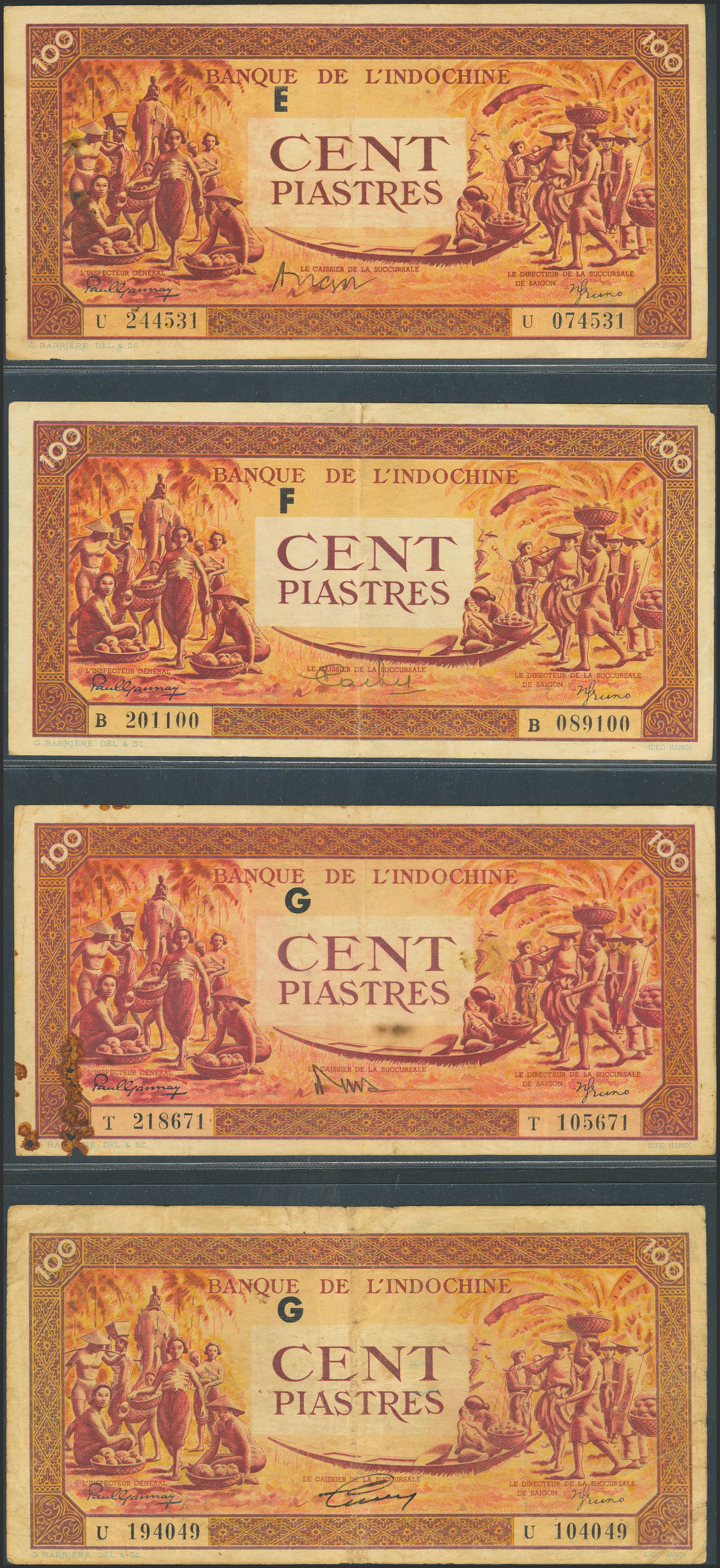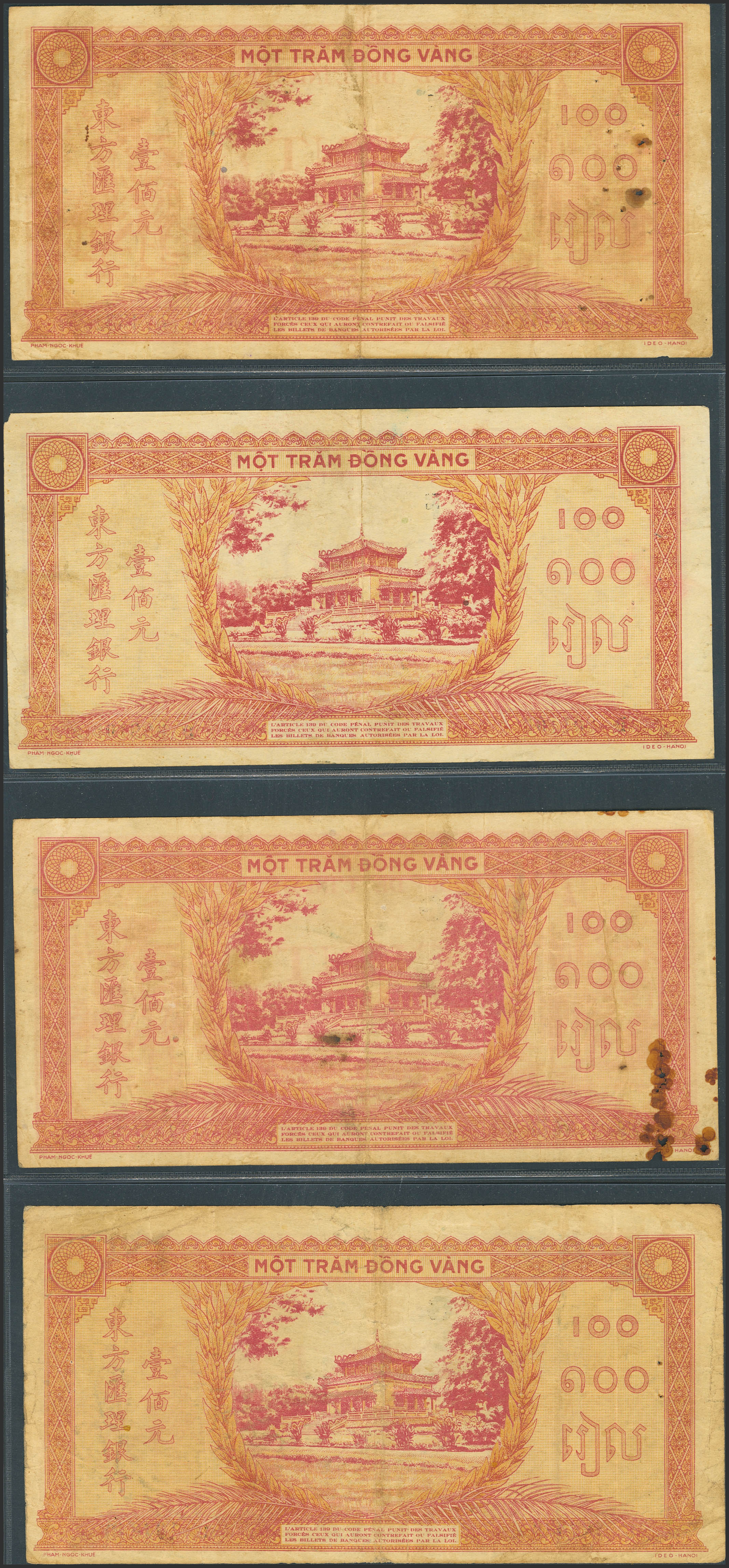 English FRENCH INDOCHINA. Lot of 4 notes of 100 Piastres. (1942ca). Banque de L'Indochine. Different signatures. (Pick: 66). Fine.