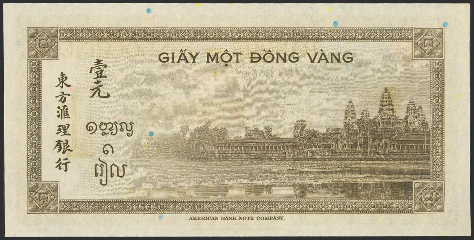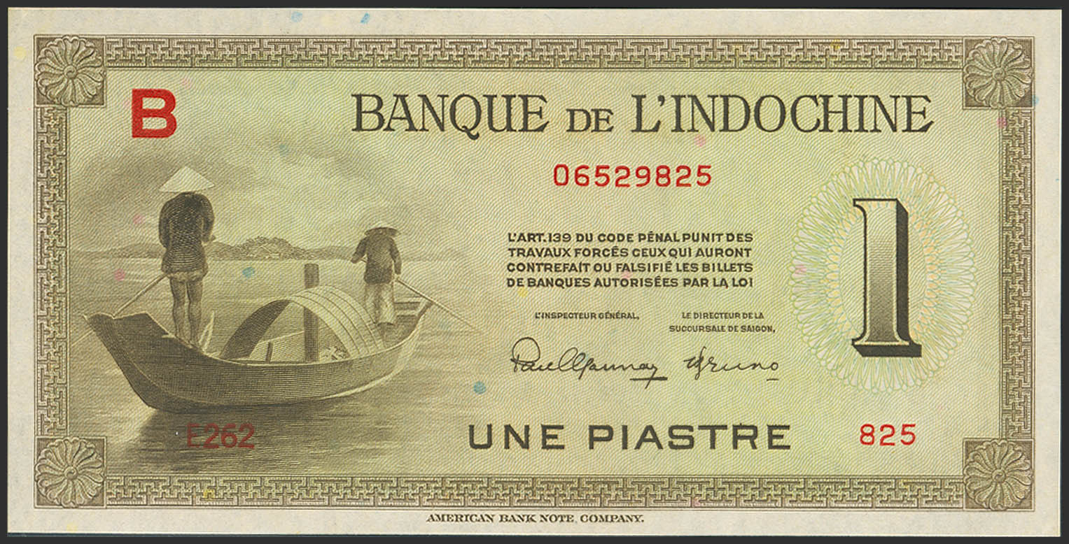 FRENCH INDOCHINA. 1 Piastre. (1945ca). Banque de L'Indochine. Block letter B. (Pick: 76a). Uncirculated.