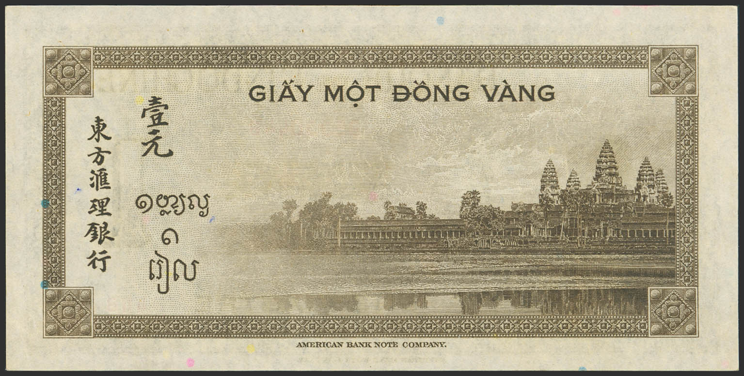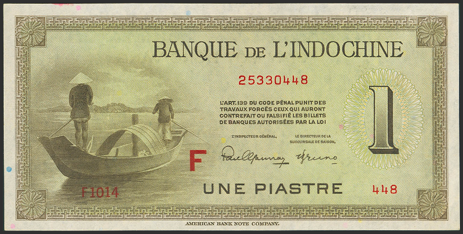 English FRENCH INDOCHINA. 1 Piastre. (1945ca). Banque de L'Indochine. Block letter F. (Pick: 76c). More than Extremely Fine.