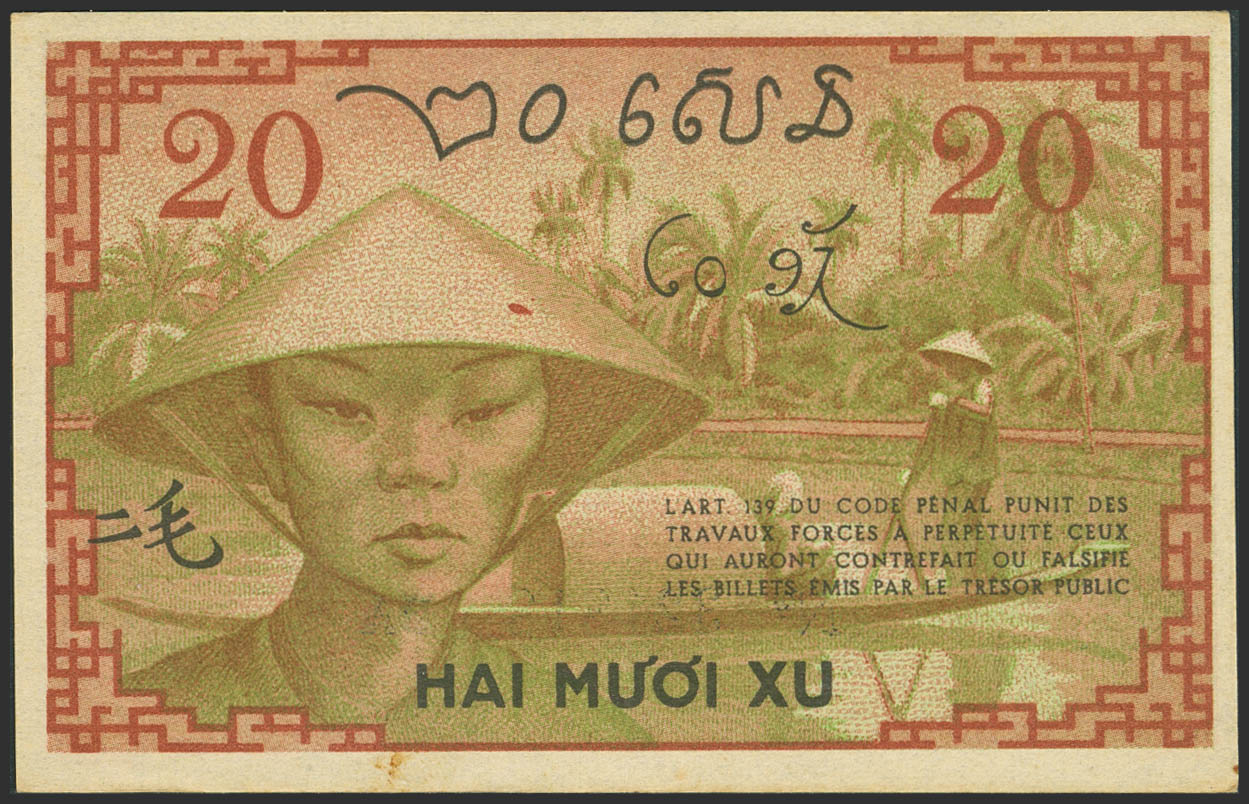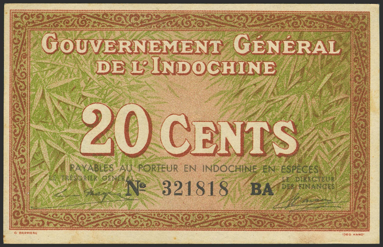 FRENCH INDOCHINA. 20 Cents. (1939ca). Gouvernement General de L'Indochine. (Pick: 86c). About Uncirculated.