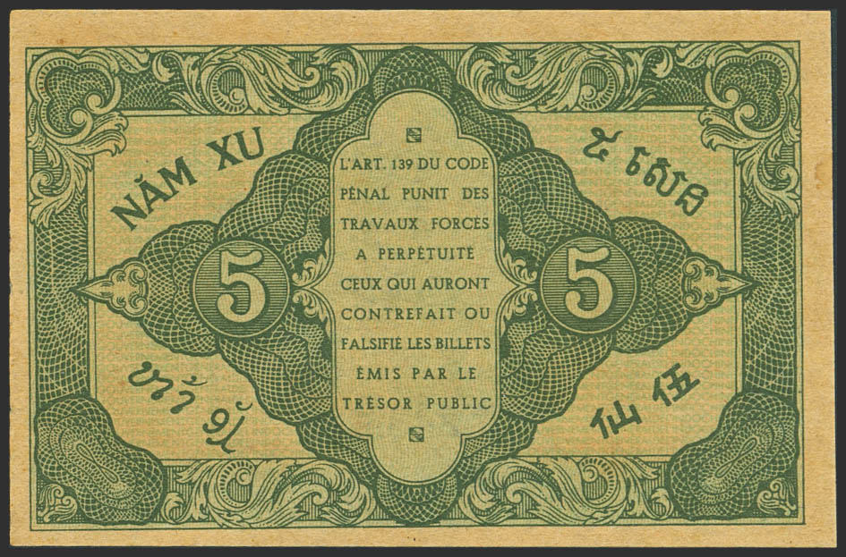 FRENCH INDOCHINA. 5 Cents. (1942ca). Gouvernement General de L'Indochine. (Pick: 88b). Uncirculated, cutting error, the printer's name can be seen on both the upper and lower edges.