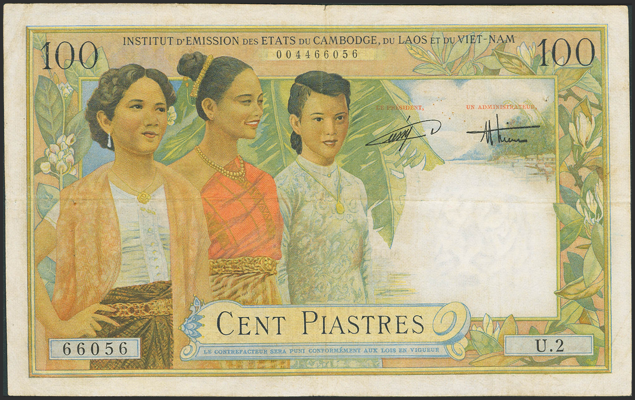 FRENCH INDOCHINA. 100 Piastres. (1954ca). Institut d'Emission des Etats du Cambodge, du Laos et du Vietnam. Vietnam. (Pick: 108). More than Very Fine.