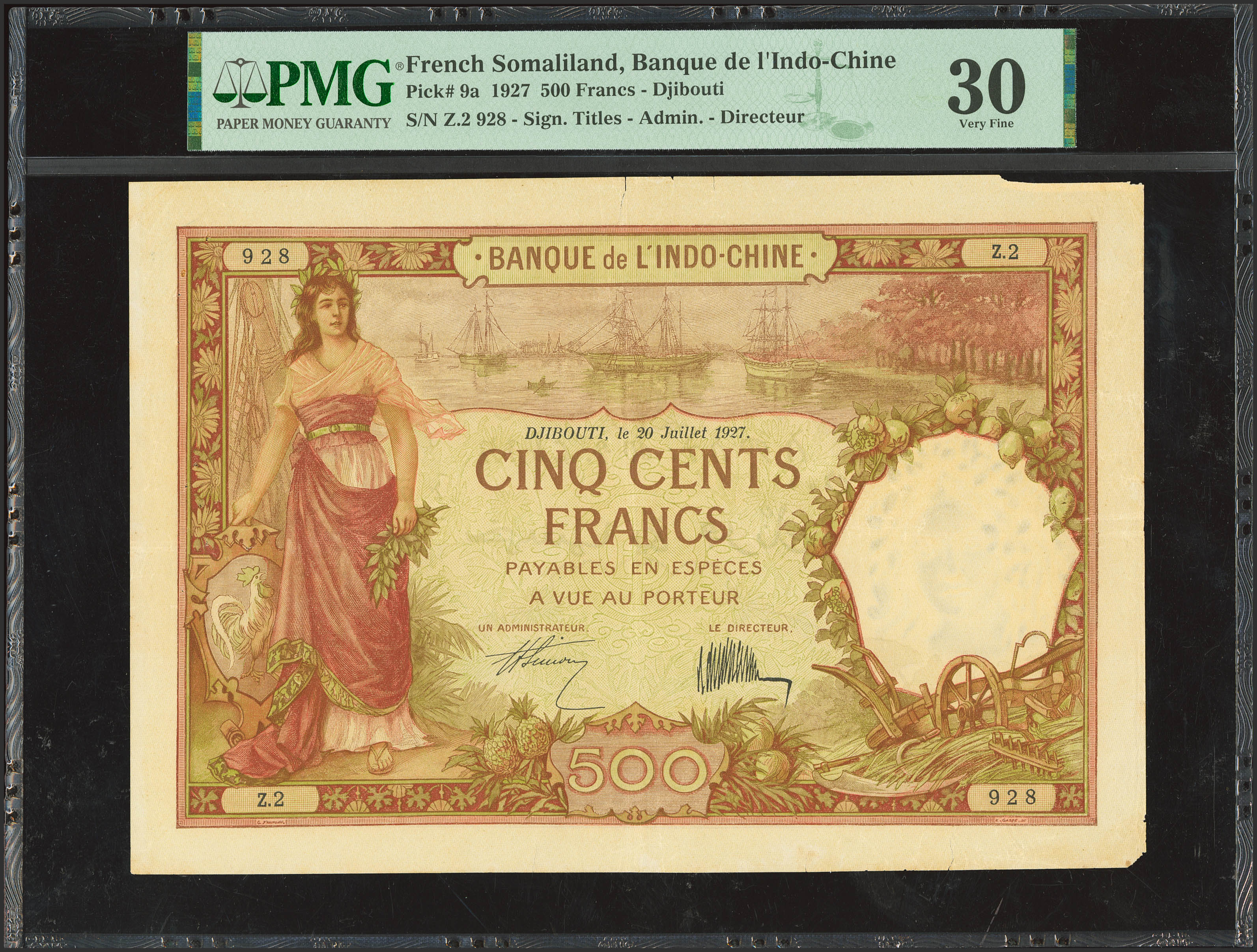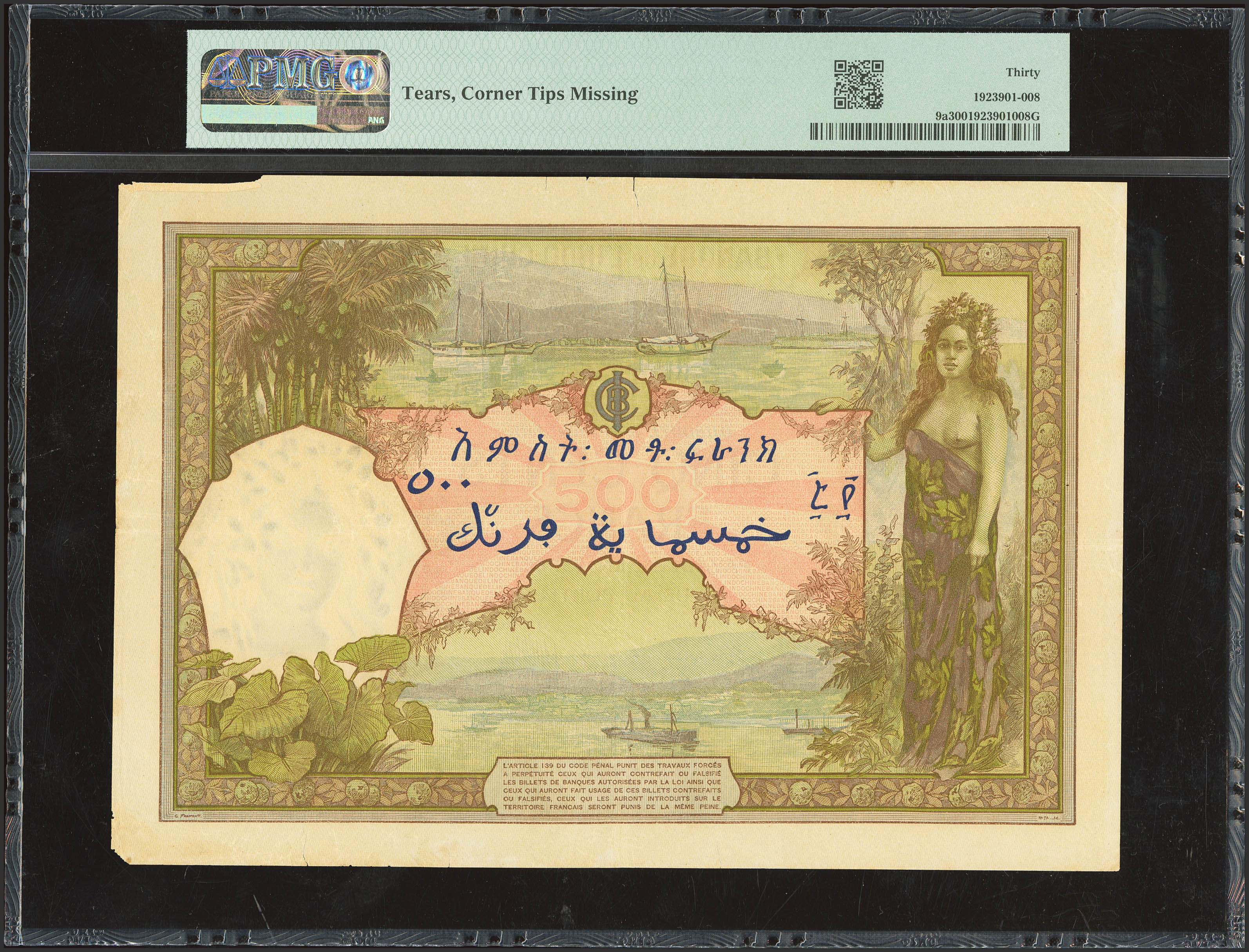 FRENCH SOMALILAND. 500 Francs. 20 July 1927. Banque de L'Indochine. Djibouti. (Pick: 9a). PMG30 (tears, corner tips missing).