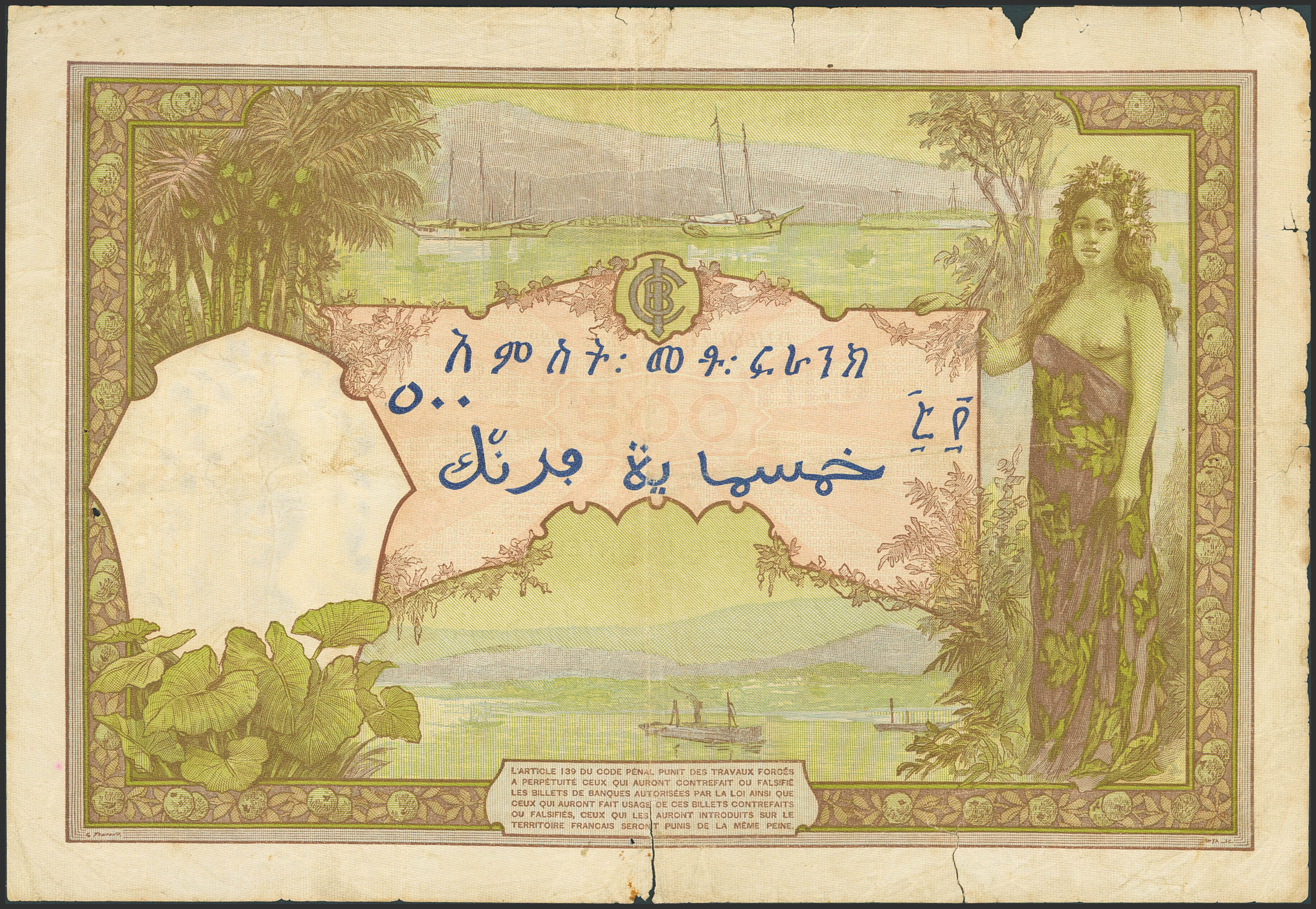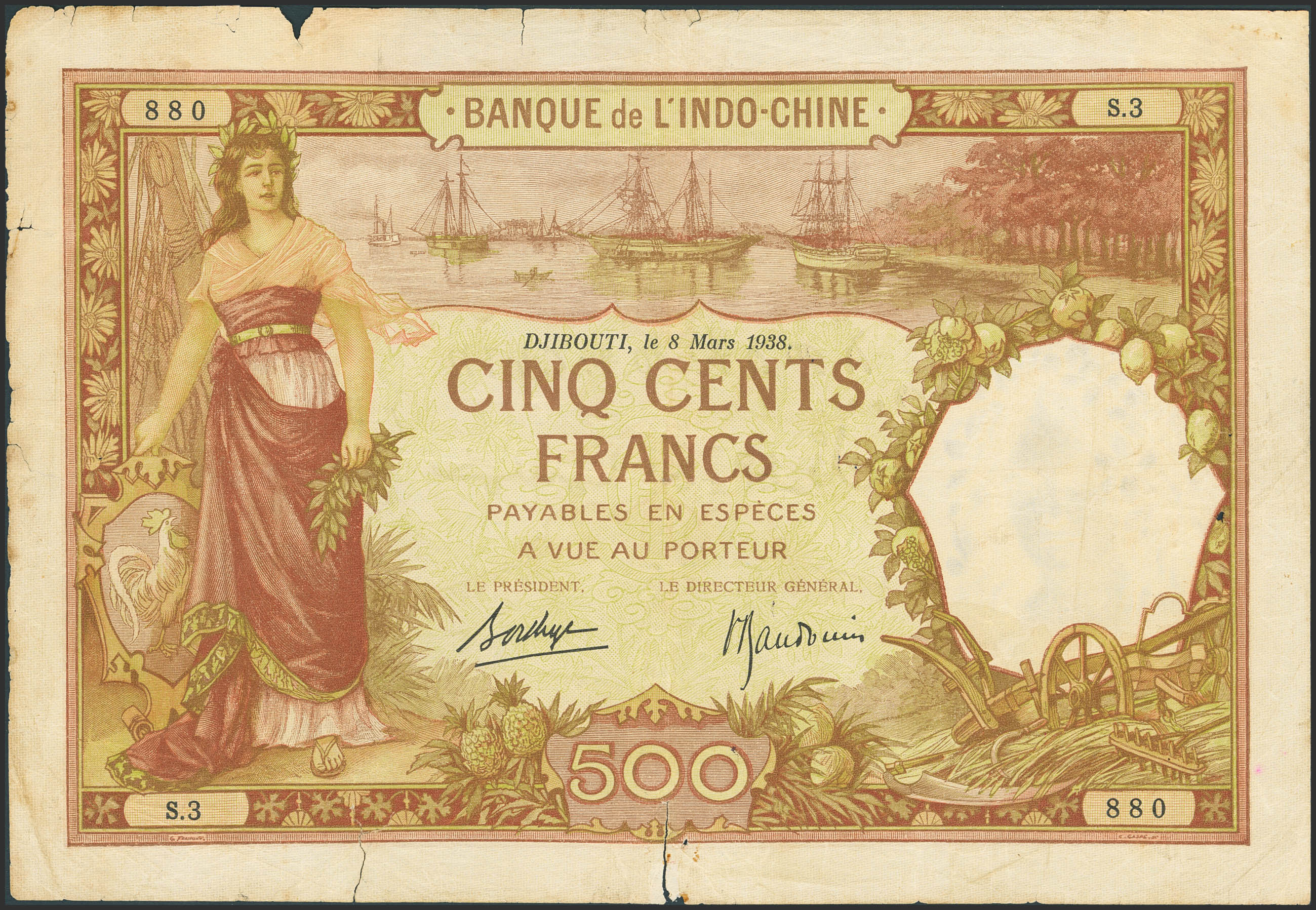 FRENCH SOMALILAND. 500 Francs. March 8, 1938. Banque de L'Indochine. Djibouti. (Pick: 9b). Fine, pinholes, tears. Nicks.