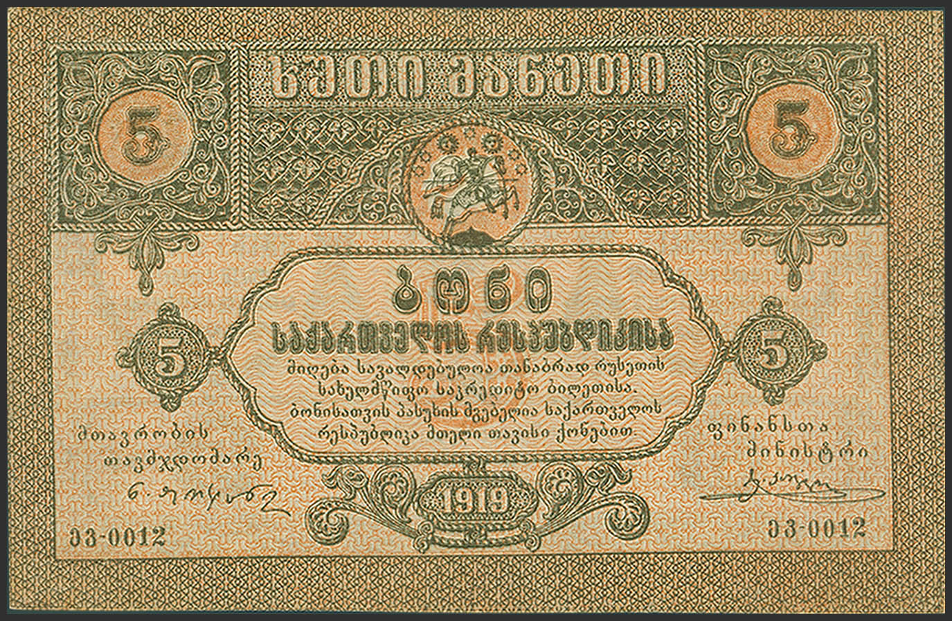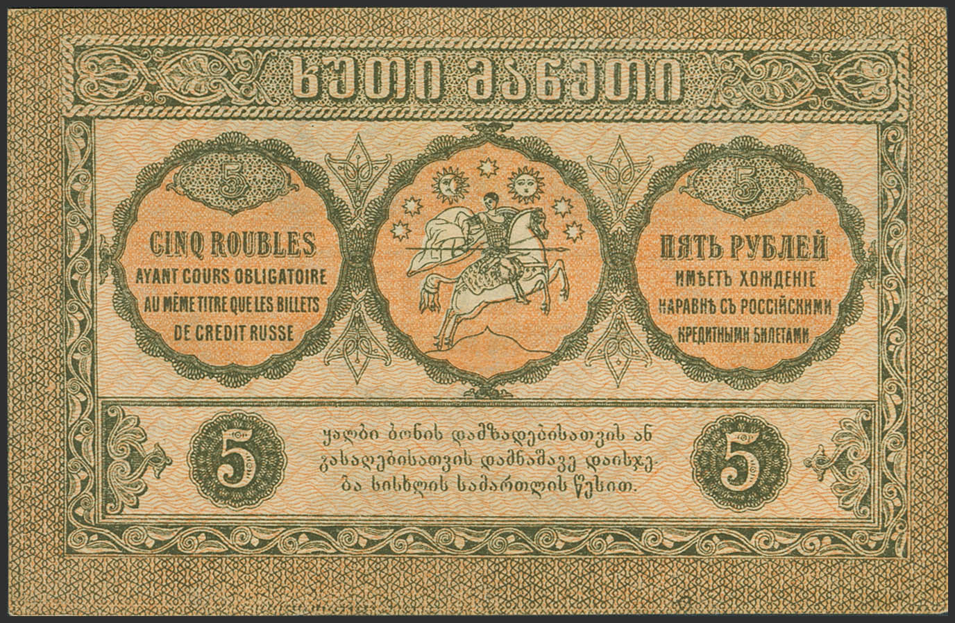 English GEORGIA. 5 Roubles. 1919. Georgian Republic. (Pick: 9). Several corners folded but no central fold. Almost Uncirculated.