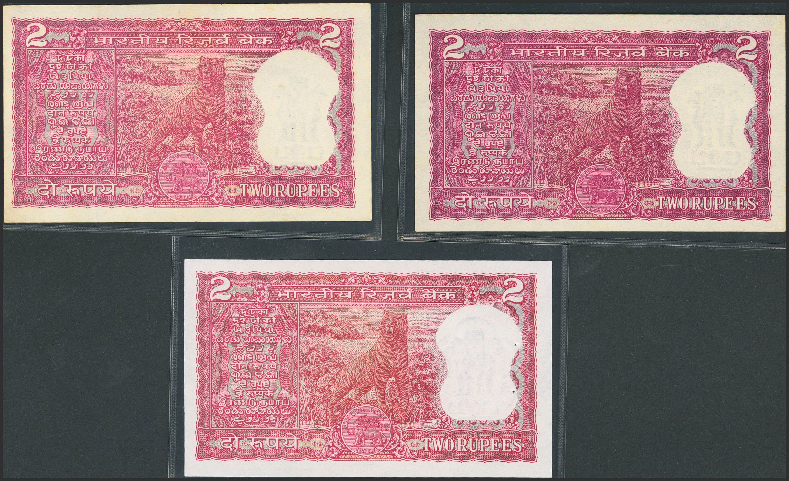 INDIA. Lot of 3 notes of 2 Rupees. (1970ca). Reserve Bank. (Pick: 53a, 53c, 53g). Less than Uncirculated (1), Uncirculated (2), staple holes at issue.