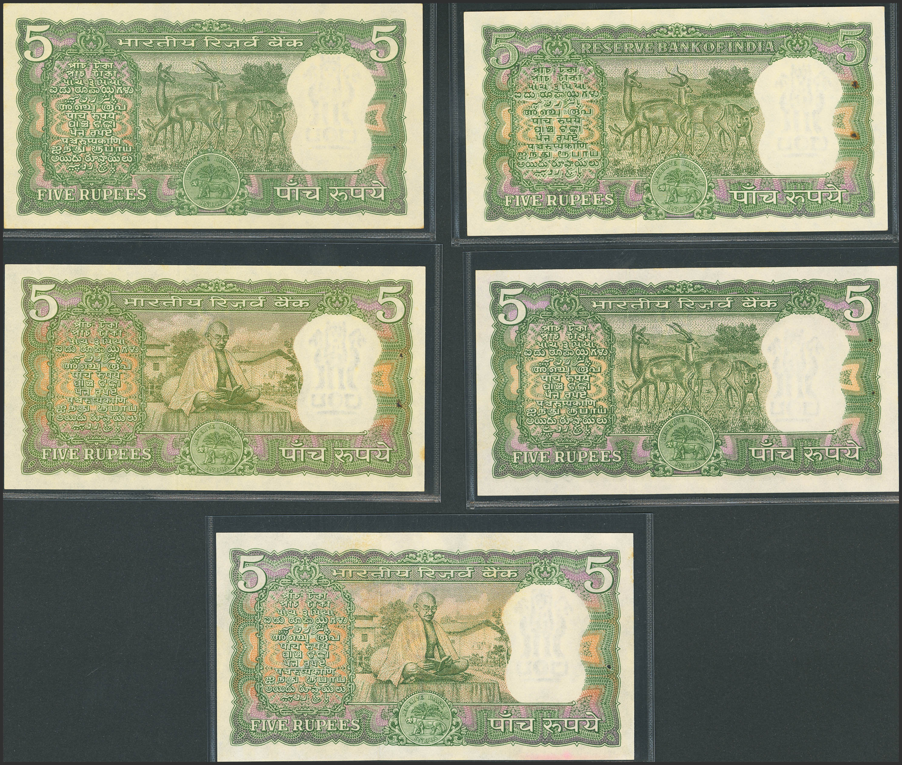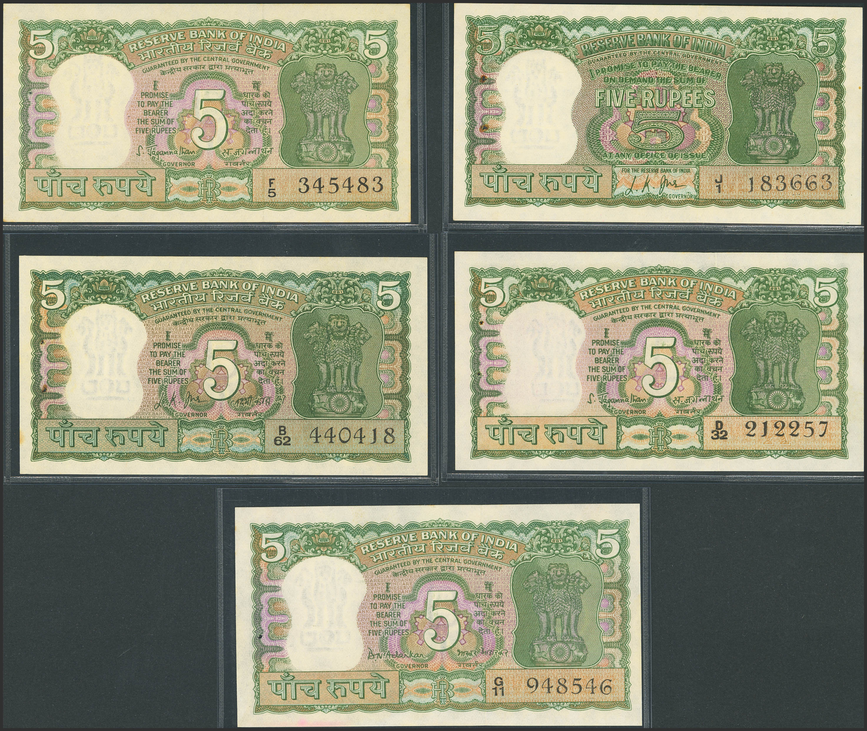 INDIA. Lot of 5 notes of 5 Rupees. 1962-1969. Reserve Bank. (Pick: 54b, 55, 56b, 68a, 68b). Less than Uncirculated (3) and Uncirculated (2), staple holes at issue.