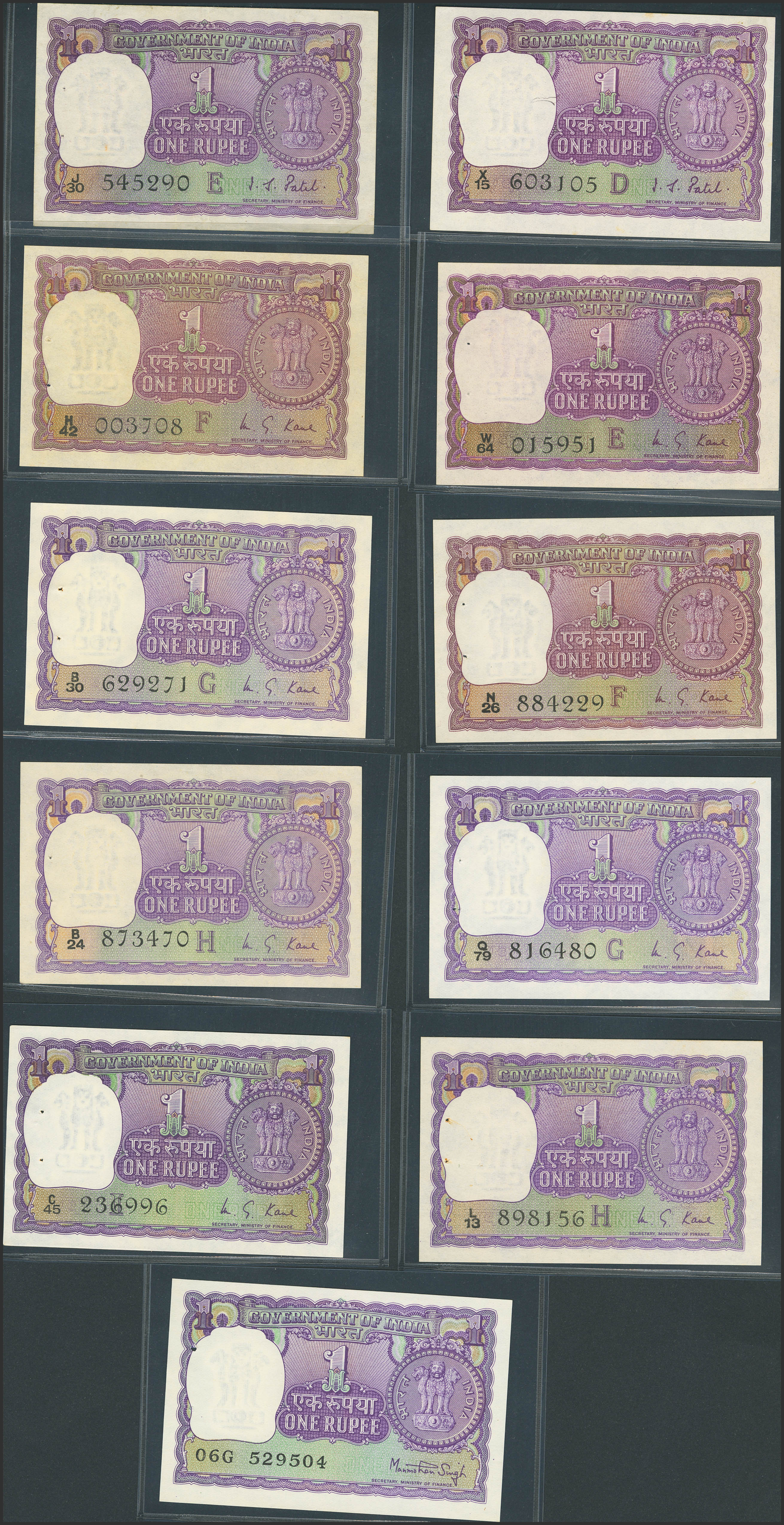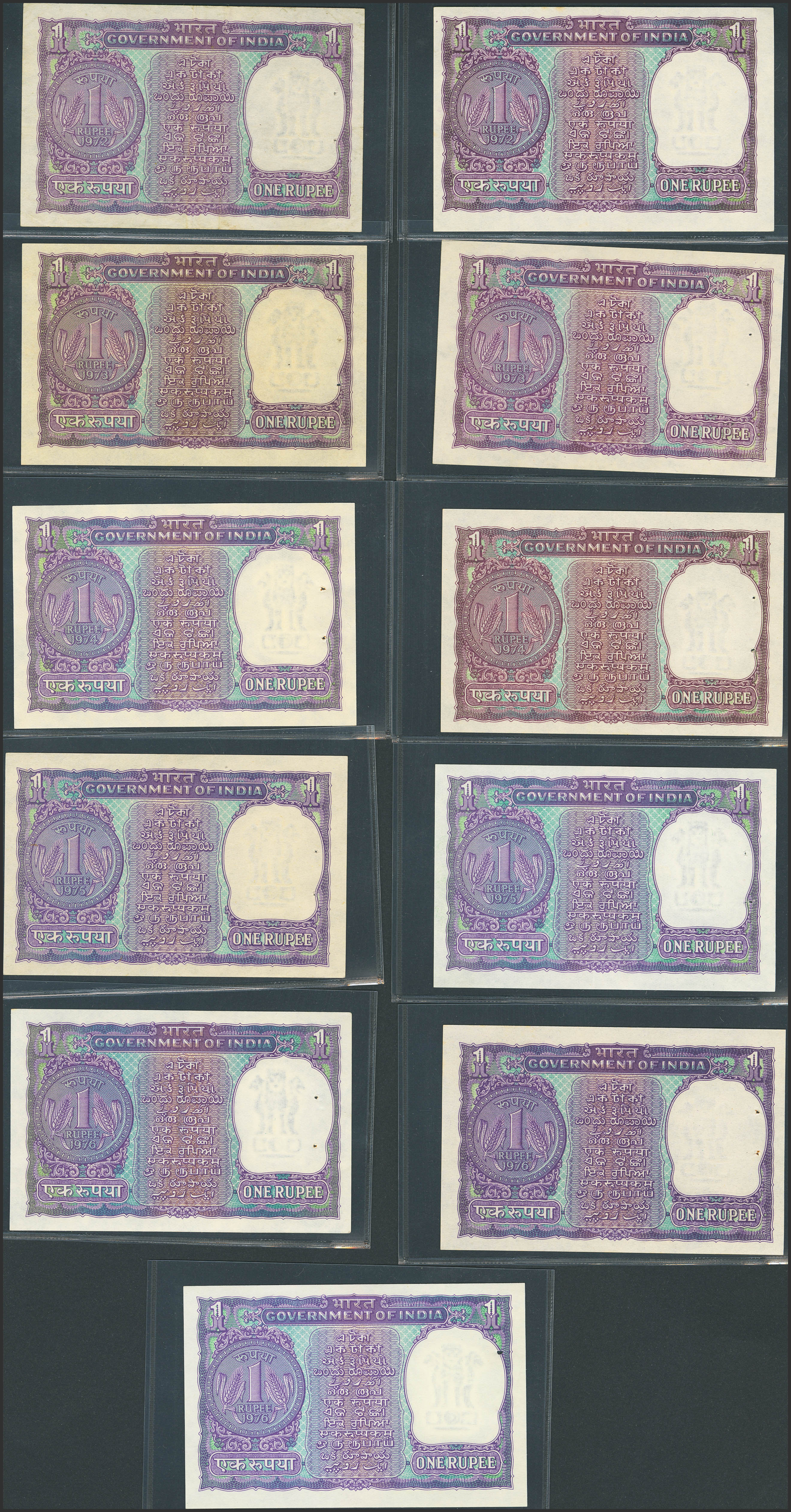 INDIA. Lot of 11 notes of 1 Rupee. 1972-1976. Government. Mixed signatures. (Pick: 77j, 77k, 77l, 77m, 74n, 77o, 77p, 77q, 77r, 77s, 77t). Extremely Fine (1), Almost Uncirculated (6) and Uncirculated (4), staple holes at Issue.
