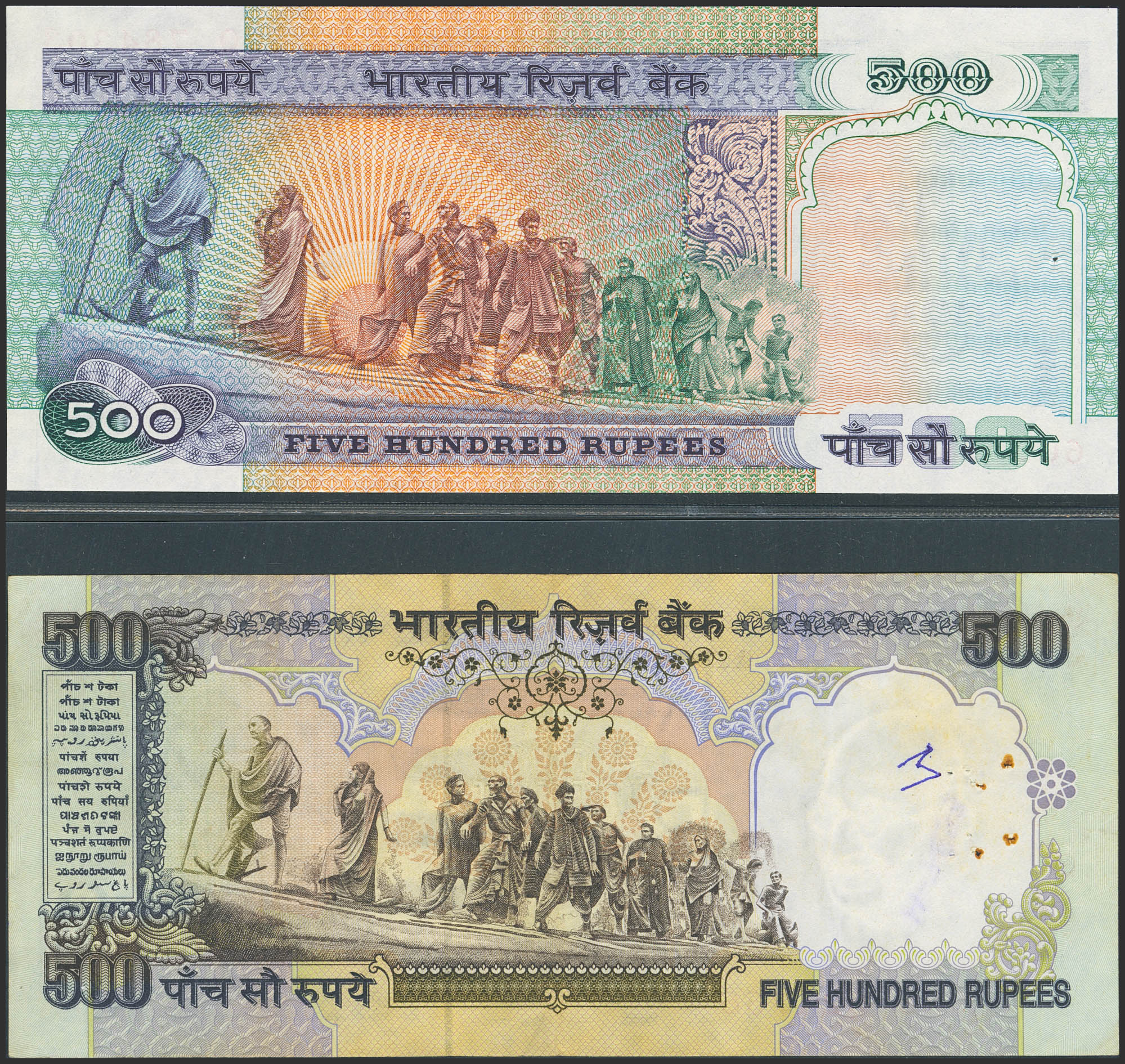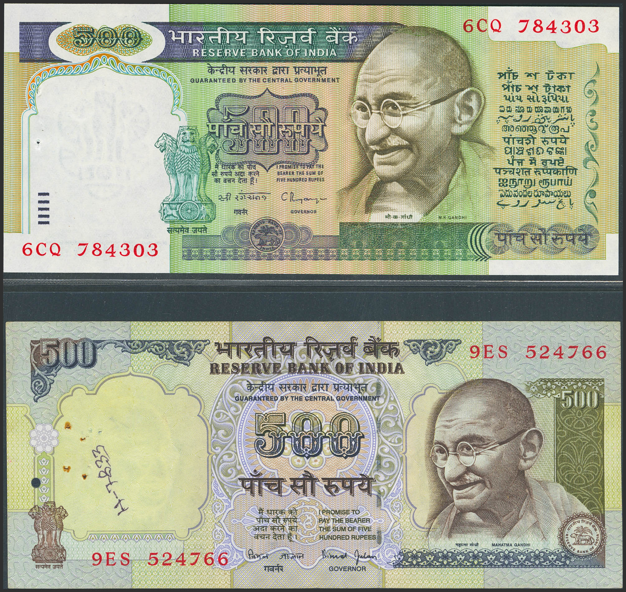 INDIA. Lot of 2 notes of 500 Rupees. (1987ca). Reserve Bank. (Pick: 87c, 92b). More than very fine and Uncirculated, staple holes at issue, pinholes and graffiti on one of them.